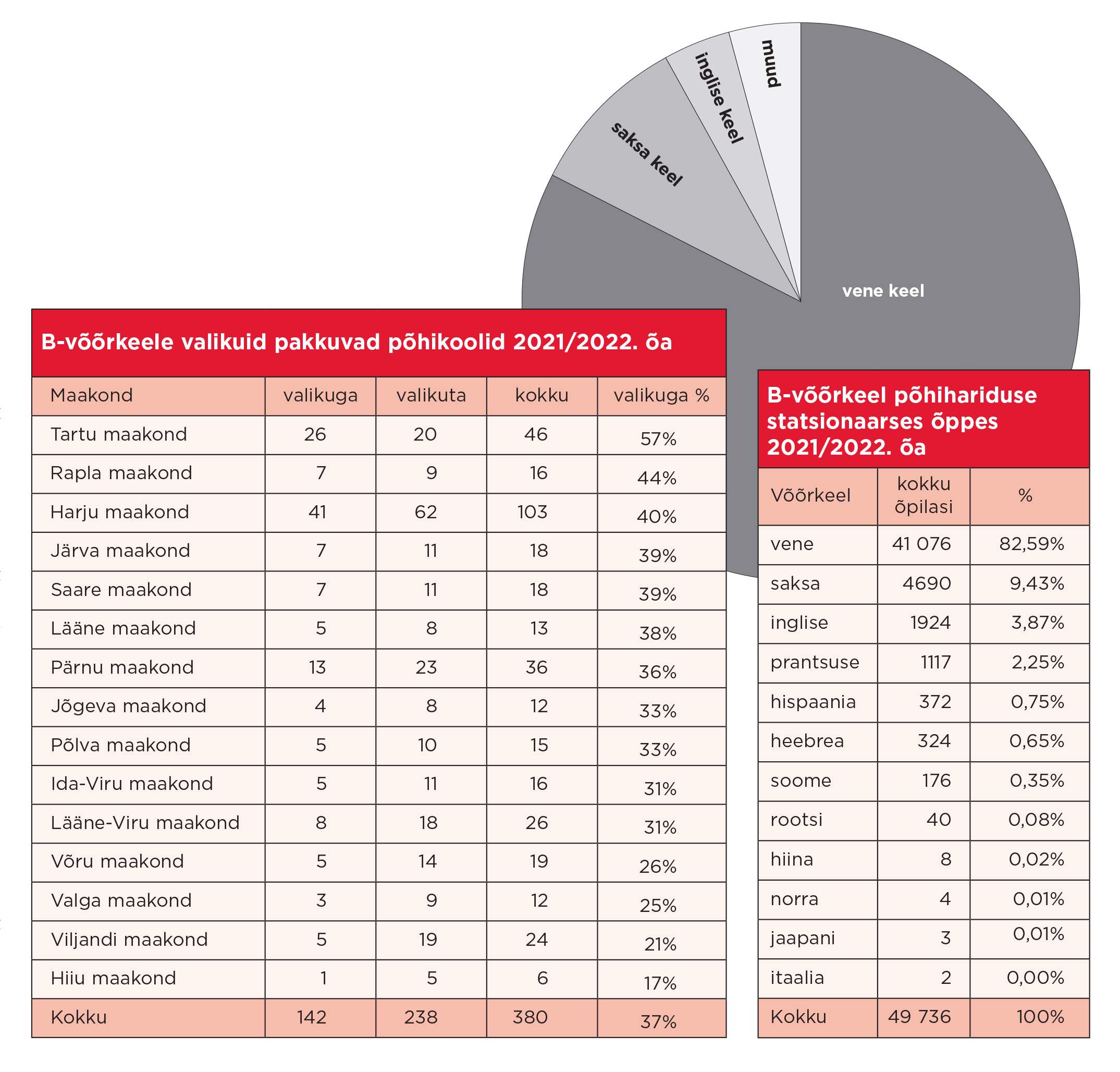 Praegu kehtiva riikliku õppekava järgi on koolidel võimalus õpetada eesti õppekeelega põhikoolis esimese ehk A-võõrkeelena kas inglise, prantsuse, saksa või vene keelt. Riiklik õppekava võimaldab õpetada põhikoolis teise võõrkeelena ükskõik millist võõrkeelt, arvestades kooli võimalusi ja õpilaste soove. B-võõrkeelena õpetatakse peamiselt vene, saksa, inglise või prantsuse keelt. Eelmise õppeaasta andmed näitavad, et pisut üle 82% põhikooliõpilastest õpib B-võõrkeelena vene keelt. Järgnevad saksa keel – 9,4% ja inglise keel − 3,8%. Soome ja rootsi keel on alles 7. ja 8. kohal.