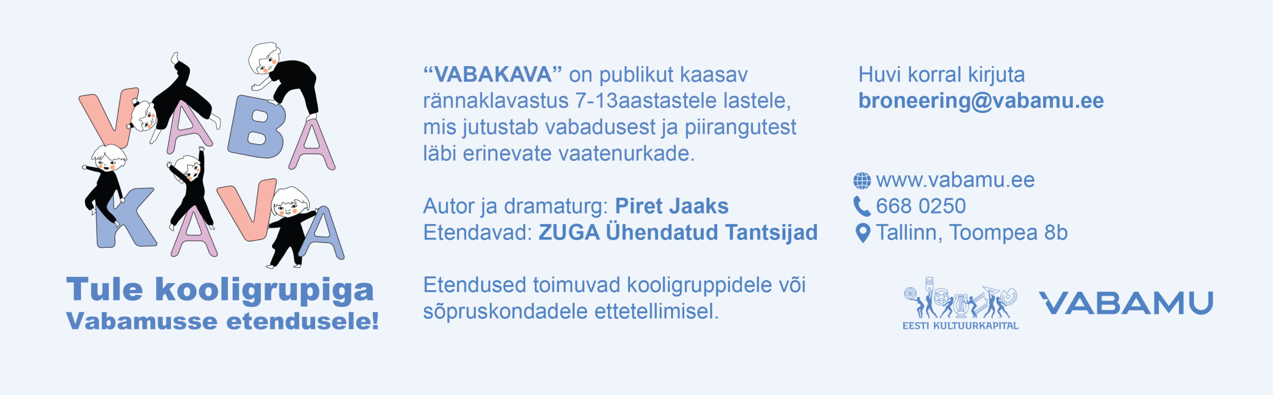 Ootame 7–13-aastaseid lapsi publikut kaasavale rännaklavastusele „Vabakava“, mis jutustab vabadusest ja piirangutest eri vaatenurkadest. Lavastus kulgeb mööda Vabamu ruume ja uurib, kuidas tajuda vabadust kogu kehaga ja kõikide meeltega. Trupp avab vabaduse mõistet lastepäraselt, puudutades allegooriliselt ka Eesti vabaks saamise lugu.