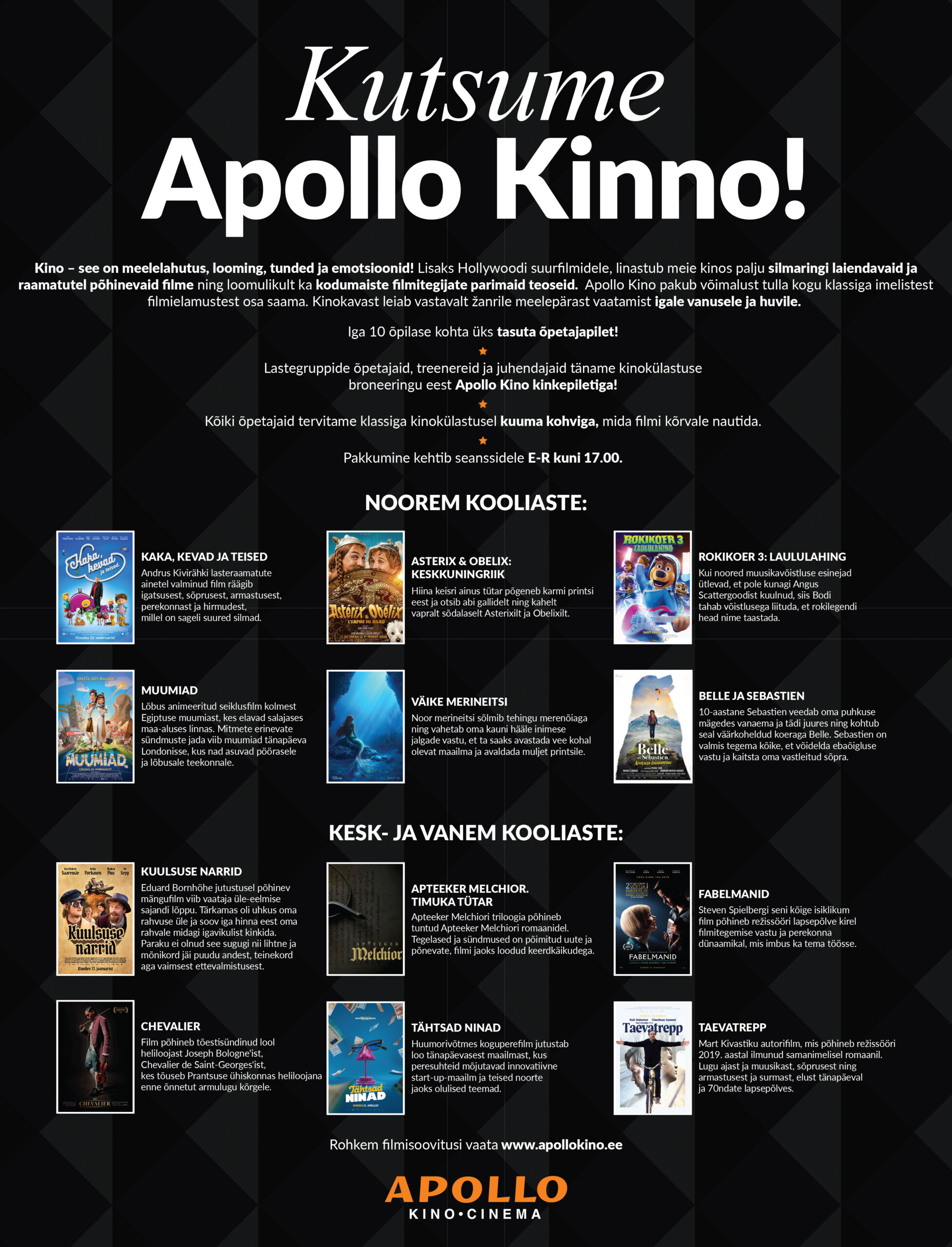 Kogu hooaja kultuuriprogrammiga saab tutvuda ja leida endale sobiva Apollo Kino kodulehel www.apollokino.ee.