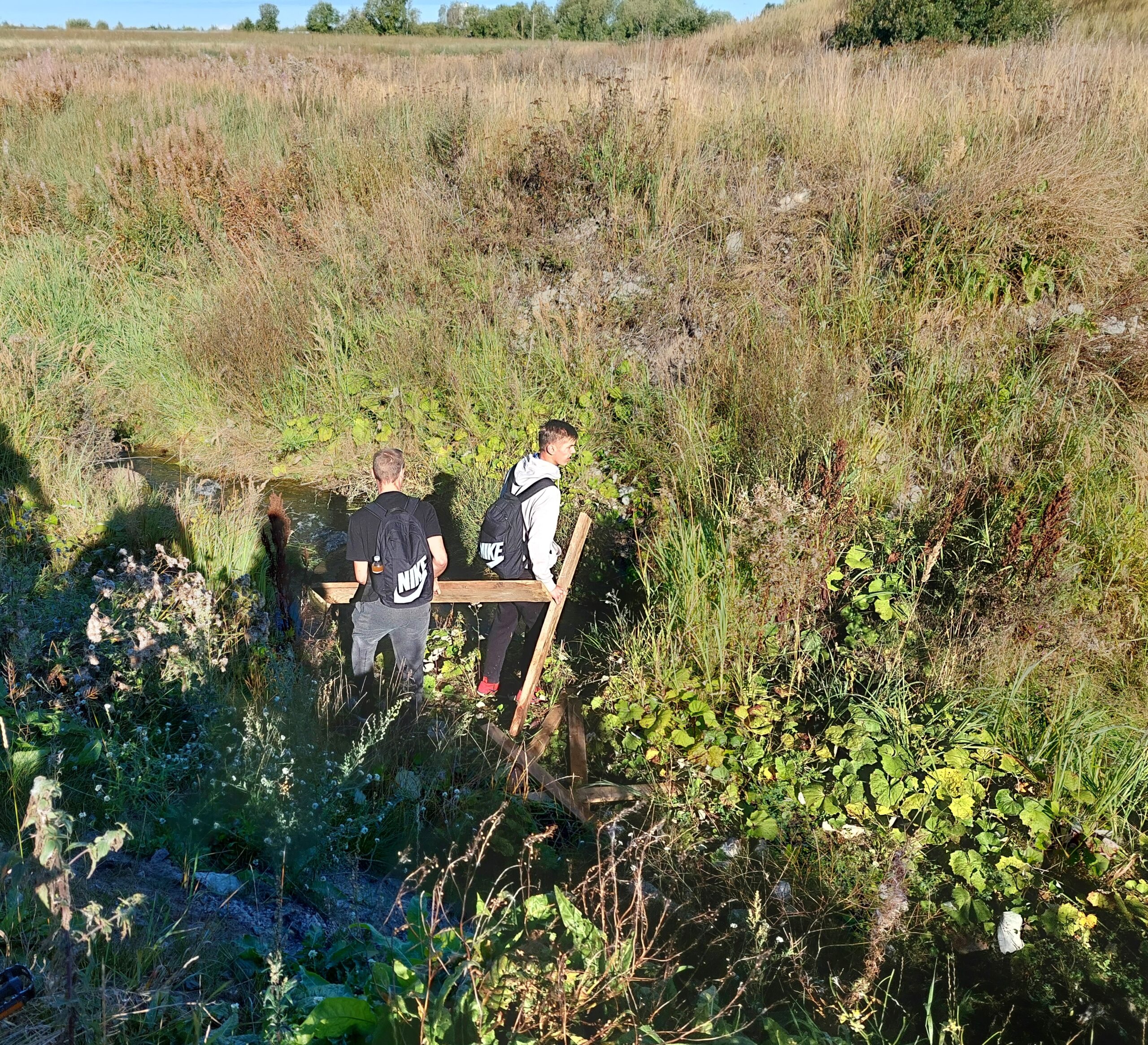 Matkapäeva hommikul viisin neli saetud lauda kraavi juurde ja kui seltskonnaga lagendiku äärde jõudsime, selgitasin põgusalt eesolevat olukorda, viipasin käega järgmise kogunemiskoha suunas ning andsin esimestele kaasa sae. Tahtsin, et noored ise lahenduse leiaksid ja siis ka tegutseksid. Paju jäi püsti. Laudadest ehitati tugev purre ja ketina hakati rattaid teisele kaldale saatma.