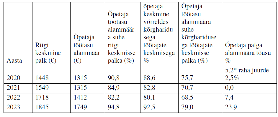 Eesti õpetaja on magistriharidusega spetsialist. Seega peab Eesti õpetaja töötasu olema Eestis kõrgharidusega spetsialistide töötasuga vähemalt võrdne. Eestis on kõrgharidusega spetsialistide töötasu riigi keskmisest töötasust ligikaudu 20% kõrgem.