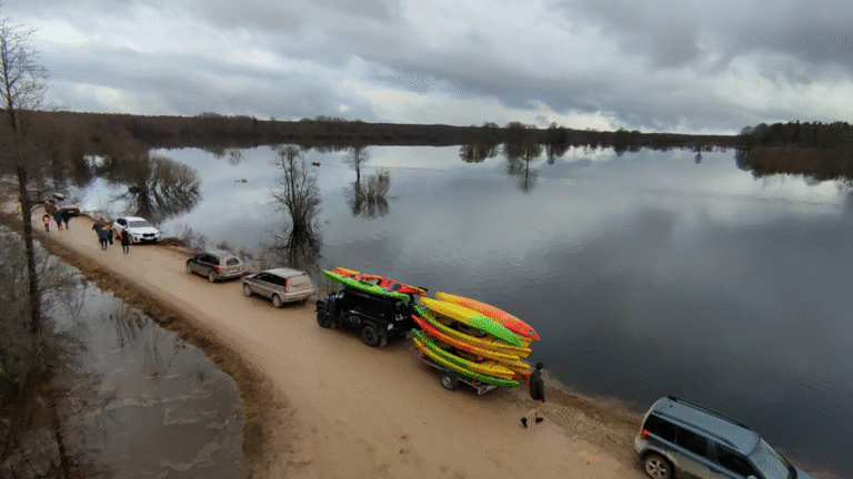 Väga tore oli Tõramaa puisniidu vaatetornist alla vaadata. Pilvisesse ja halli vaatepilti lisasid mõnusalt särtsu erkkollased ja -rohelised paadid, mida oli tee ääres virnadena. Puisniidul laiuval veteväljal särasid paatidega sõitjate erkrohelised päästevestid.