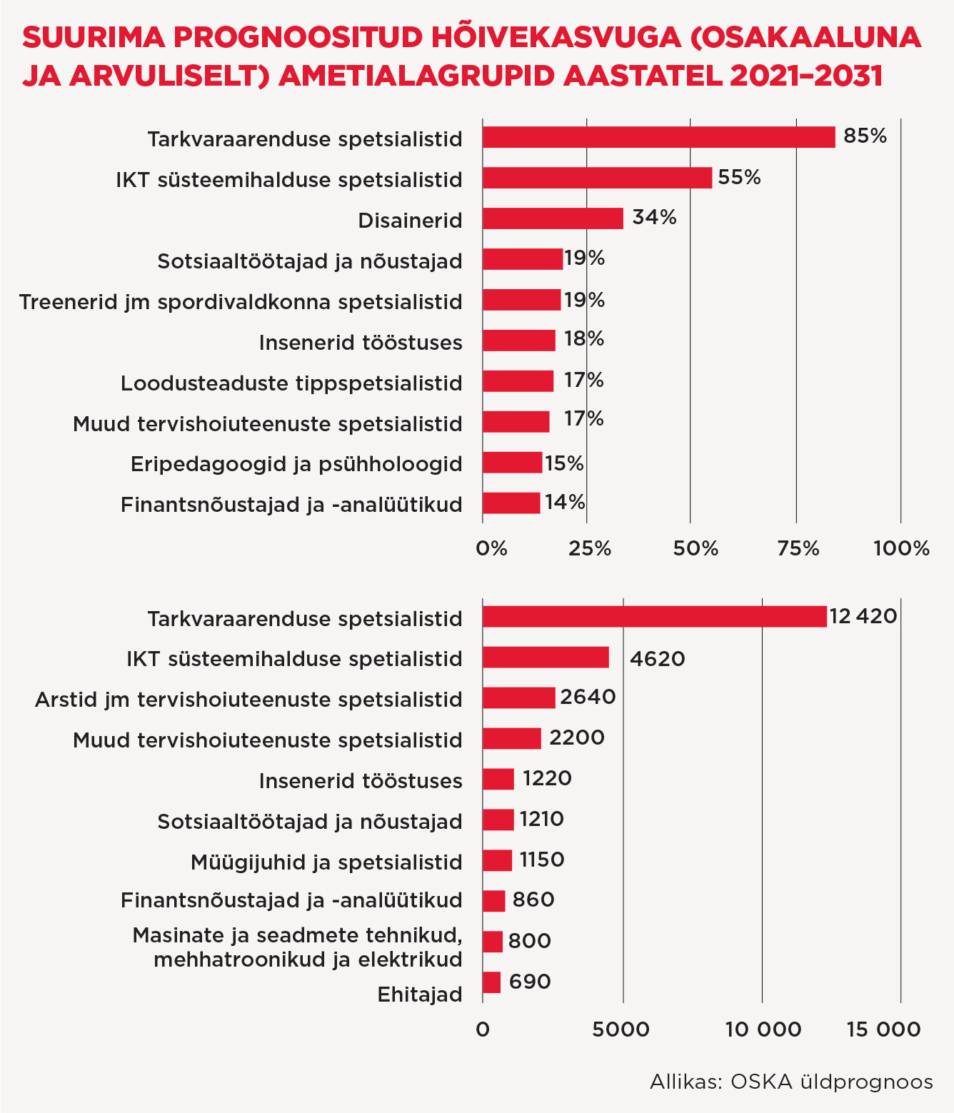 OSKA prognoosi kohaselt lisandub kümne aastaga arvuliselt enim töökohti info- ja kommunikatsioonitehnoloogia ametialagruppidesse (tarkvaraarenduse spetsialistid, IKT süsteemihalduse spetsialistid) ning tervishoiu valdkonda. Kasvavate ametialagruppide esikümnes on ka sellised tehnikaala ametid, nagu insenerid tööstuses, mehhatroonikud ja elektrikud, ehitusinsenerid ja -tehnikud.