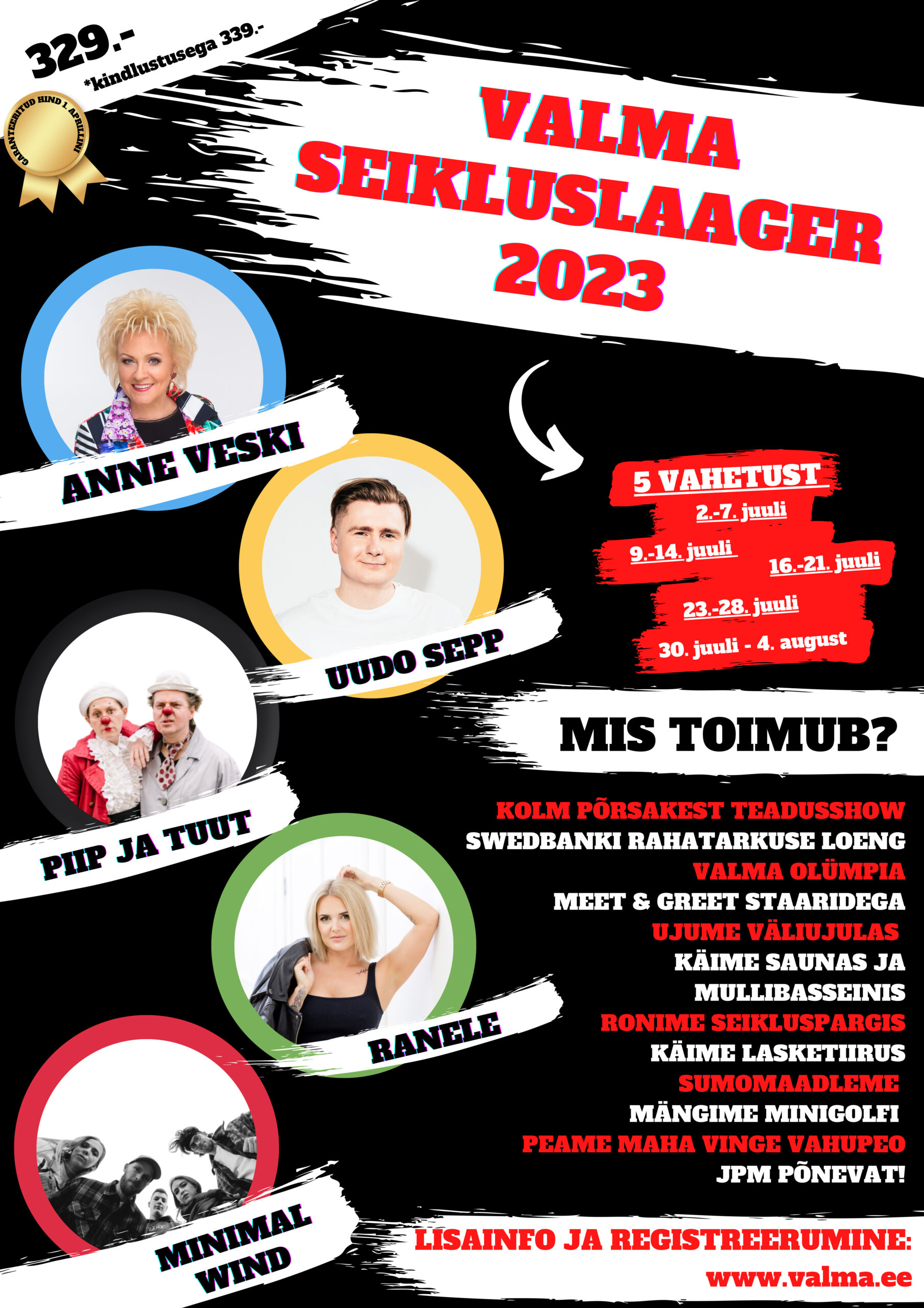 NB !!! Lisaks anname teada, et VALMA SEIKLUSLAAGER tuleb taas – sel korral vingemalt kui kunagi varem! Viljandimaal Võrtsjärve ääres Valma Seikluspargis toimub 2023. aasta suvel juba üheksandat korda üle Eesti ja ka välismaal palju positiivset tuntust kogunud Valma Seikluslaager. Laagrivahetusi on kokku viis.