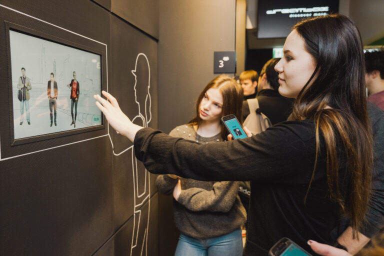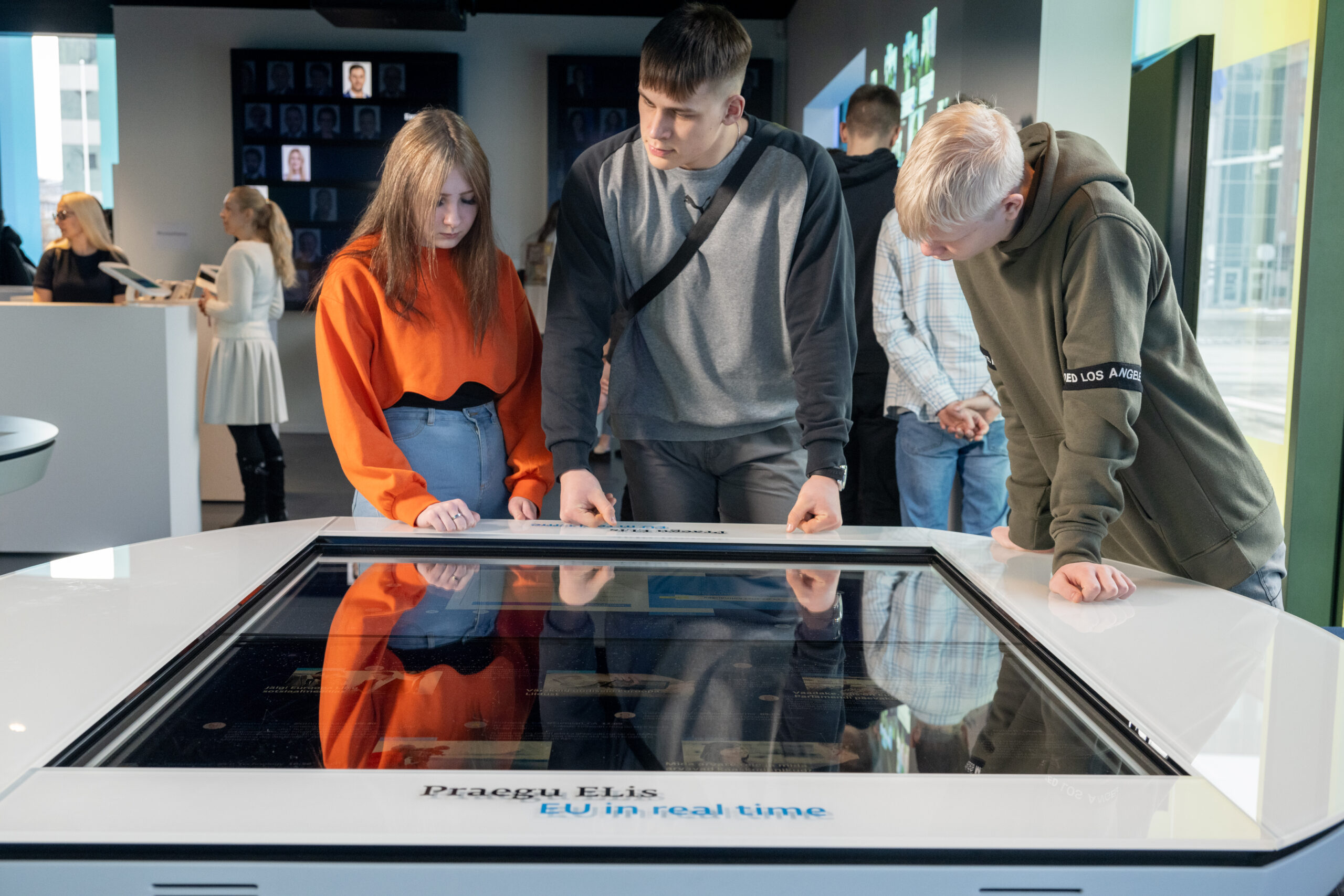 Kõigepealt külastasid noored Euroopa Elamuskeskuse interaktiivset näituseala, kus vaatajaile avanes virtuaalne teave Euroopa Liidu ja selle kolme institutsiooni kohta – need on Euroopa Parlament, Euroopa Komisjon ning Euroopa Liidu Nõukogu. Virtuaalselt tutvustasid ennast Euroopa Parlamendi 705 saadikut ja kõigist liikmesriikidest pärit Euroopa Komisjoni volinikud. Näitlikust ülevaatest selgus, kuidas kulgevad Brüsselis tööprotsessid. Temaatilistel laudadel avanesid mitmesugused teemad, nagu EL-i toimimine ja institutsioonidevaheline tööjaotus, kodanike isiklikud kogemused EL-i ja sealt saadavate toetustega, aktuaalsed sündmused ja väljakutsed EL-is, samuti teave suuremahuliste Euroopa Liidu projektide kohta.