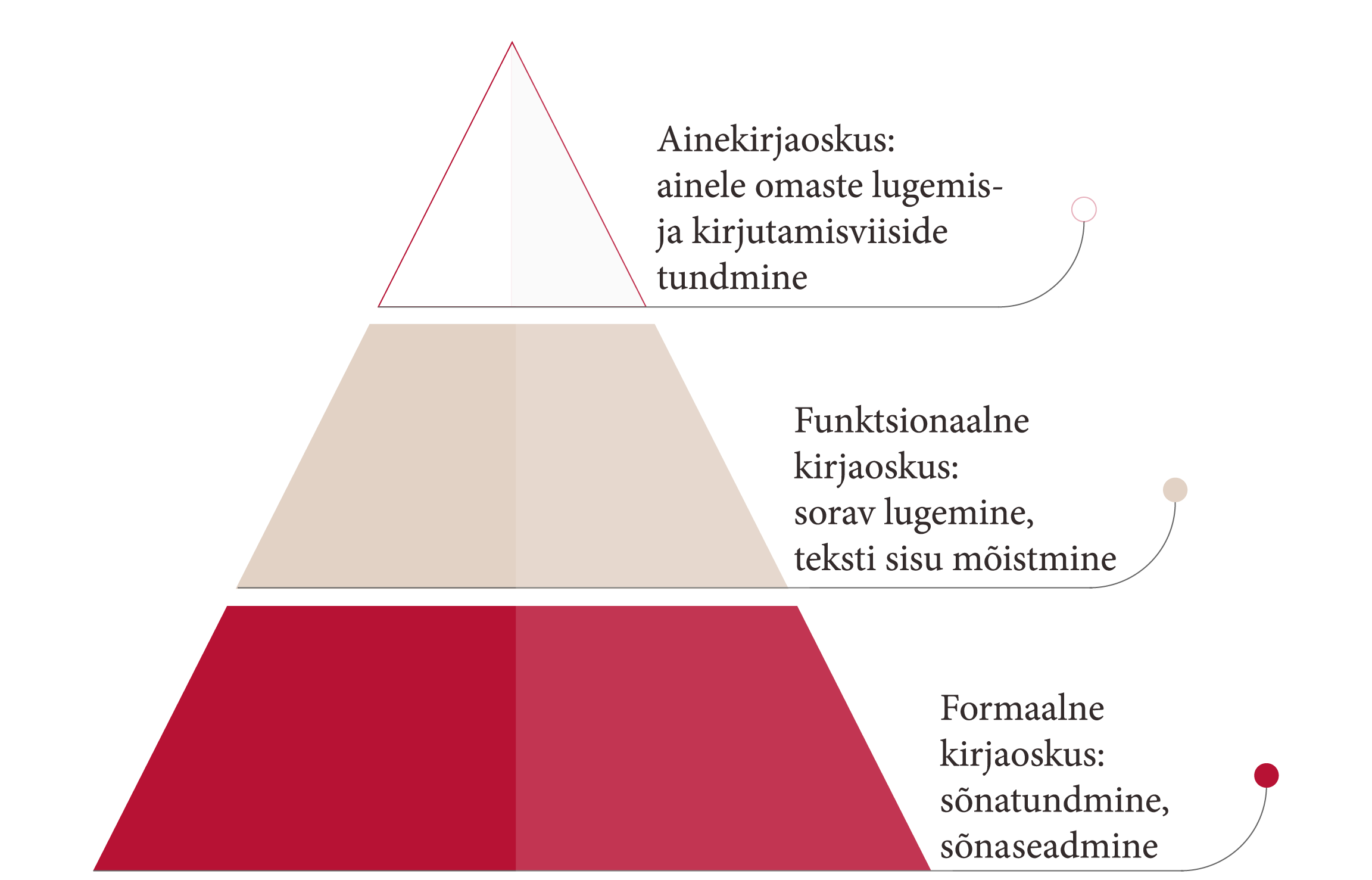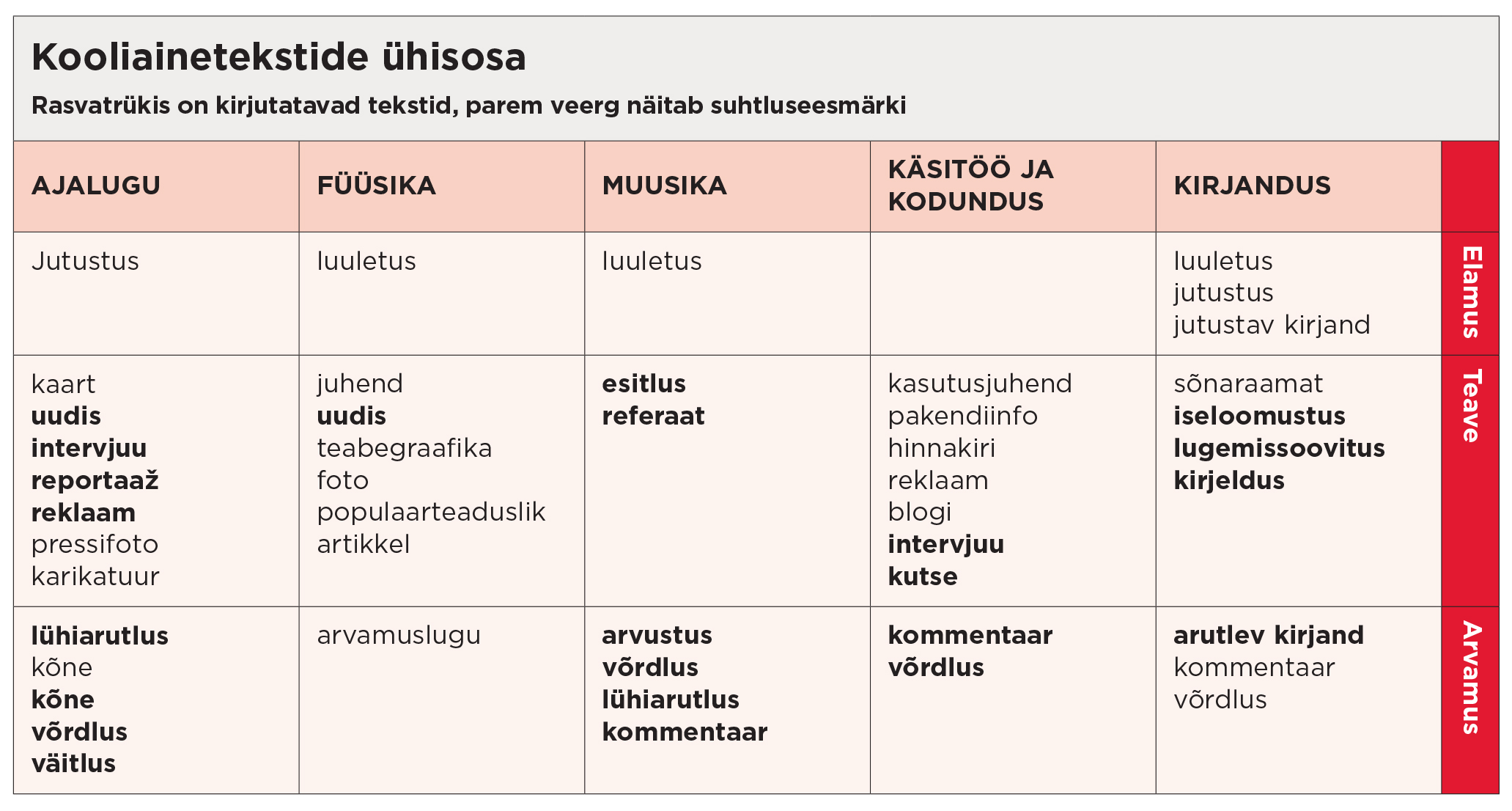 Igal ainel on oma väärtusruum, hoiakud ja žanrid ehk tekstid, millel on välja kujunenud teatud ülesehitus, lausestus ja sõnakasutus. Näiteks on loodusteaduslikud tekstid tugeva nominaalsusega, abstraktsed ja tiheda lausestusega. Ajaloos domineerib narratiivsus ja selgitamine, õppijal tuleb vallata kriitilist allikaanalüüsi ja osata tekste ajastu konteksti paigutada. Kirjandustekstide vastuvõtt eeldab poeetikakeele mõju tõlgendamist, muusikatekstid nõuavad elamuste kirjeldamiseks vajalikku sõnavara, hinnangu andmist ja interpreteerimist.
