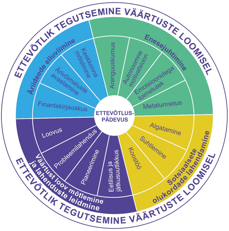 Õppematerjal toetub ettevõtluspädevuse mudelile. Mudel koosneb neljast valdkonnast, mis omakorda koosnevad 14 alapädevusest (vt joonis). Soovitame õpetajal, kes materjalidega töötama hakkab, lugeda läbi programmi „Edu ja tegu“ raamdokument ning ettevõtluspädevuse enesehindamise mudel. Need leiab programmi kodulehelt https://ettevotlusope.edu.ee, valminud on need teadlaste omavahelises koostöös, on põhjalikult läbi mõeldud ja analüüsitud.