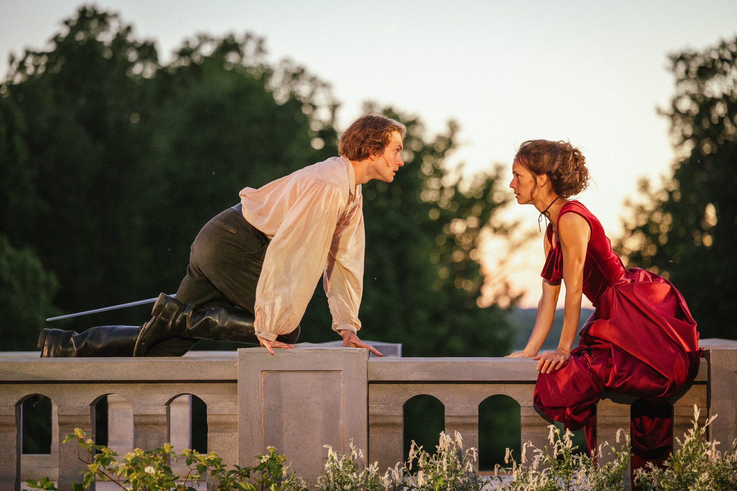 Jass Kalev Mäe ja Klaudia Tiitsmaa lavastuses „Kolm musketäri“. Foto: Priit Loog