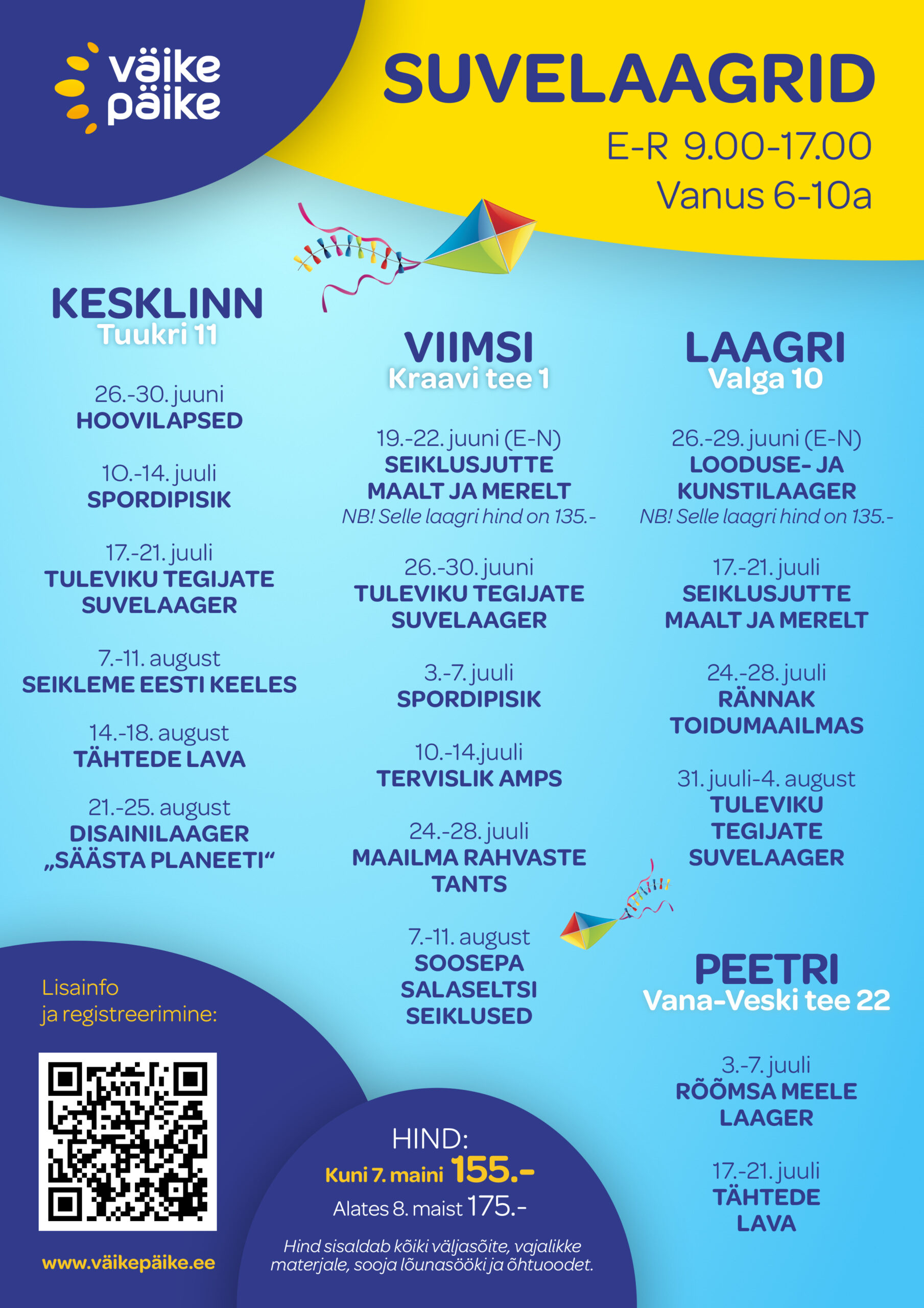 Väike Päike ootab 6–10-aastaseid lapsi linnalaagritesse Tallinnas, Tartus, Viimsis, Laagris ja Peetris.