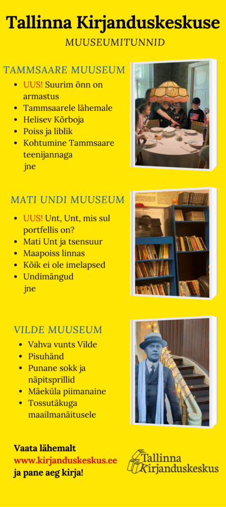 Pärast äsja toimunud Kirjandustänava festivali suurt kirjanduspidu on aeg teha plaane uueks kooliaastaks. Et kirjandustundidele vürtsi lisada, on parim võimalus külastada kirjanike muuseume. Tallinna Kirjanduskeskuse kolme muuseumi – Tammsaare, Vilde ja Mati Undi muuseumi – muuseumitundide seast leiab igaüks enda õpilastele sobiva!