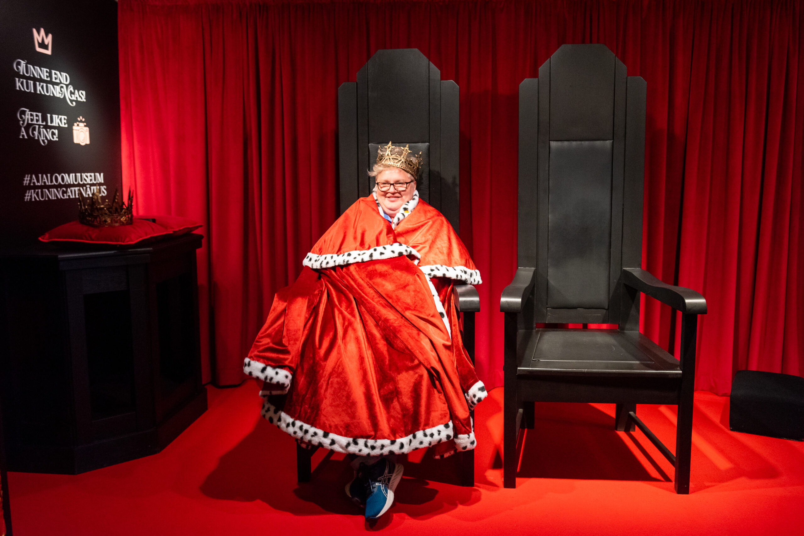 Õnnelik näitusekuraator, ajaloomuuseumi teadusdirektor Krista Sarv sai esimesena kuninglikus rüüs troonil istuda.