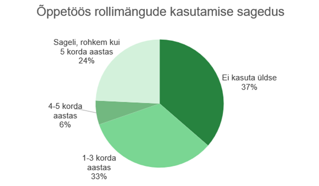 Vastanuid oli kokku 33 ja esindatud olid eri õppeainete õpetajad. Uuringust selgus, et ainetundides kasutatakse rollimänge üsna sageli. Rohkem oli neid, kes kasvõi korra aastat õppetöös seda meetodit kasutavad – kokku 63%. 37% vastanutest ei olnud rollimänge kasutanud. Üllatav oli, et ligi veerand vastanutest kasutas rollimängu sagedamini kui viis korda. Mõni isegi kümme või isegi 15–20 korda aastas.