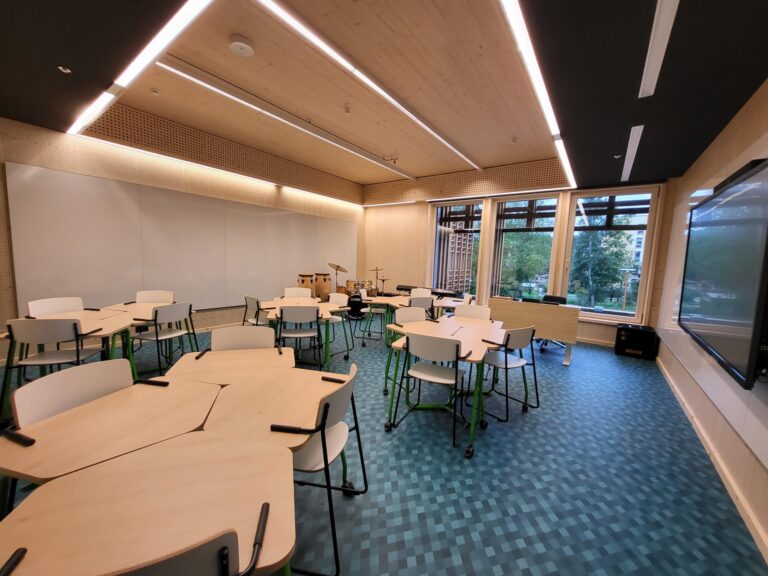 Võib öelda küll, et meie kooli põhimõtted on majas ilusti olemas. Me ei tee kooli igavalt, oleme julged. Siin on julget lähenemist, alates sellest, et meie koolimaja on Eesti suurim puitehitis, kuni selleni välja, et siin on ootamatuid värvilahendusi. Koolis on ka oma väike koolikino. Arvan, et paljudes ruumides vajub inimestel suu lahti. Majas on koos kõik, mida tänapäeva haridus vajab. Siin on palju ruume, mille suurust ja mööbli paigutust saab muuta. Paljud avatud õpiruumid soosivad koostööd, aga on ka vaikseid ruume, kus saab rahulikult süveneda.