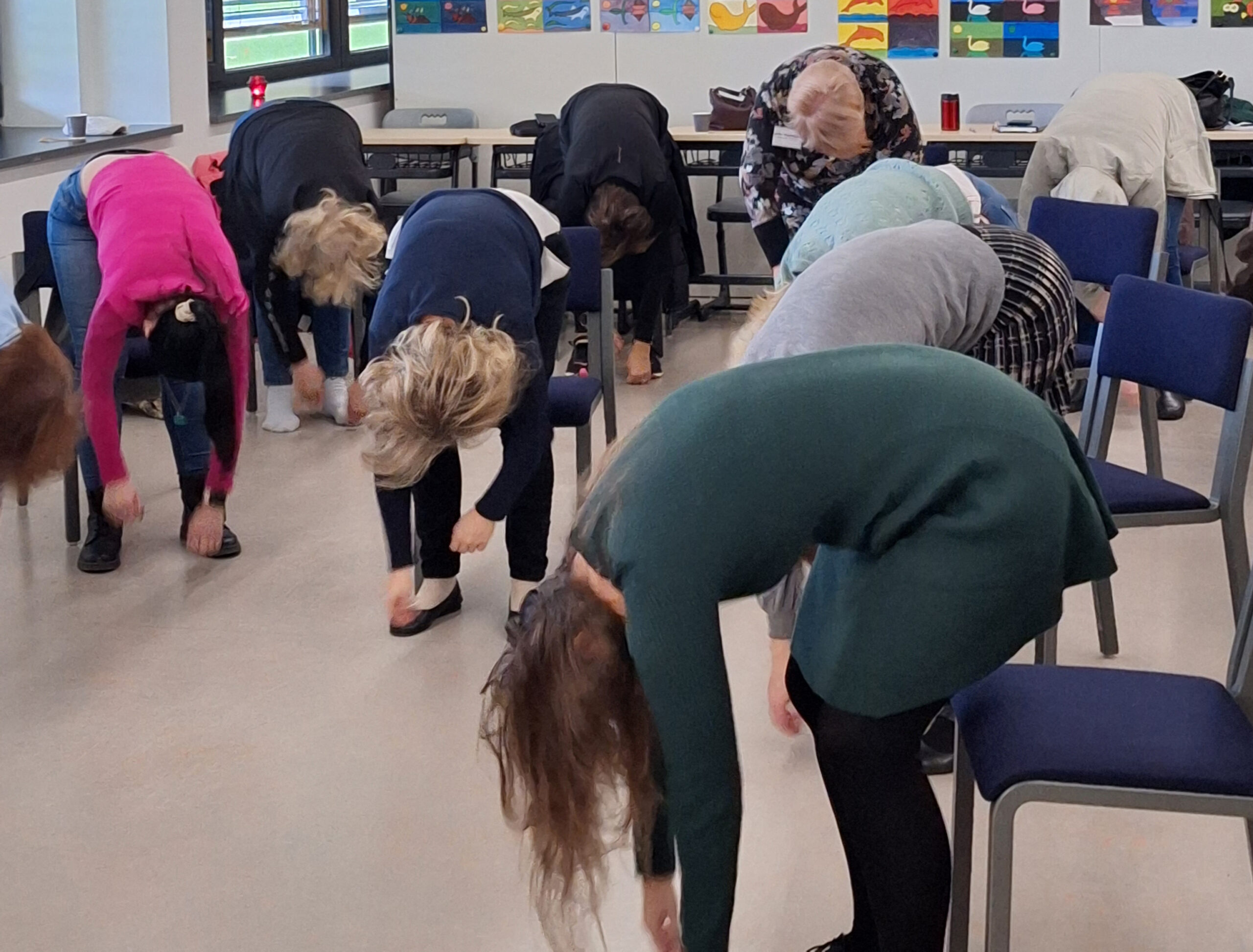 Mitmed õpetajad jagasid õpitubades kogemusi, kuidas keha turgutada. Annelinna gümnaasiumi kunstiõpetaja Erna Tamm õpetas lõõgastava muusika saatel kontorijooga harjutusi, mille sooritamiseks pole vaja matil pikali olla, neid saab teha ka toolil istudes või tooli kõrval seistes.