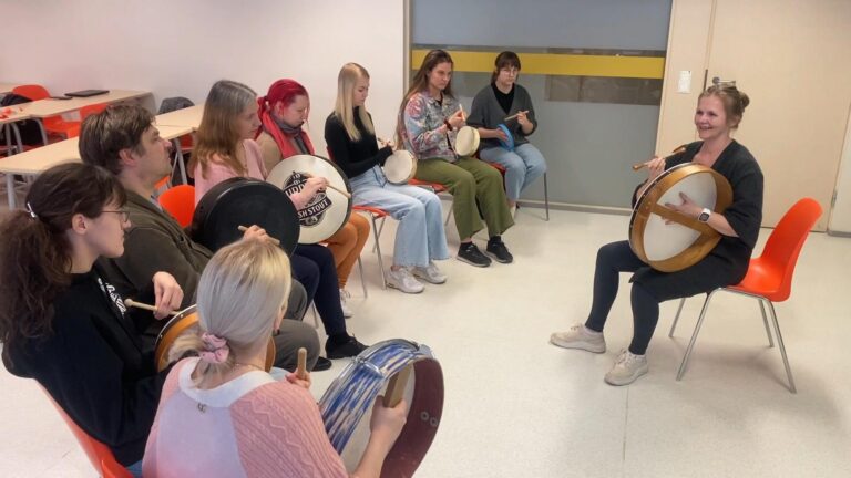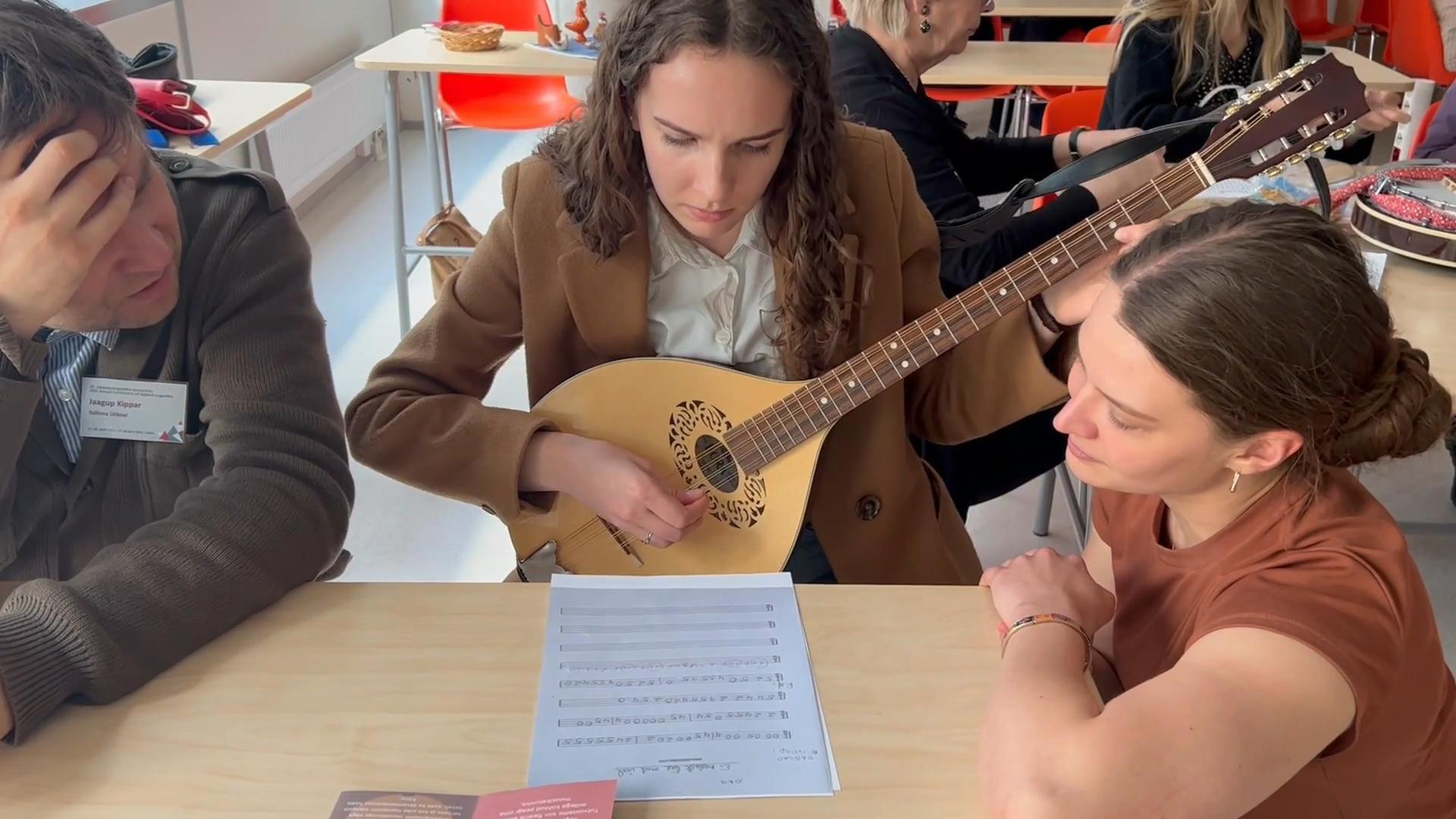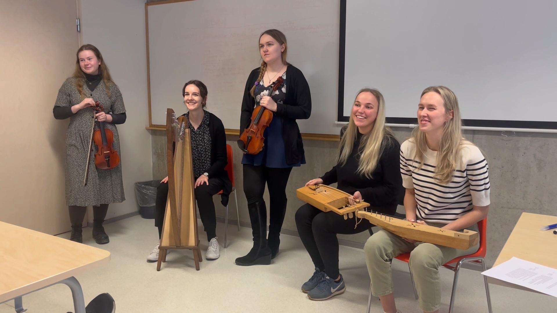 Üliõpilased mängivad rahvapillide tundi isekeskis läbi
