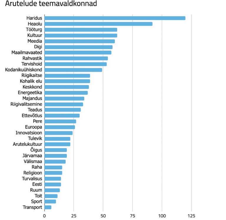 Iluideaalid ja enesehinnang (23); vaimne tervis ja heaolu (21); tervise ja heaolu edendamine (17); nutisõltuvuse ennetamine ja vähendamine (16); noorte haridus- ja tööelu (12); ühiskondlikud probleemid ja muutused (9); suhted ja suhtlemisoskus (9); ühiskondlikud probleemid ja eetika (9); kultuurilised väärtused ja normid (8); keskkond ja loodus (7); töö ja tasakaal elus (6); emotsionaalne intelligentsus koolides (5); läbipõlemise ennetamine (4); vanemlus ja lapse kasvatamine (4); alternatiivsed haridusmudelid (2).
