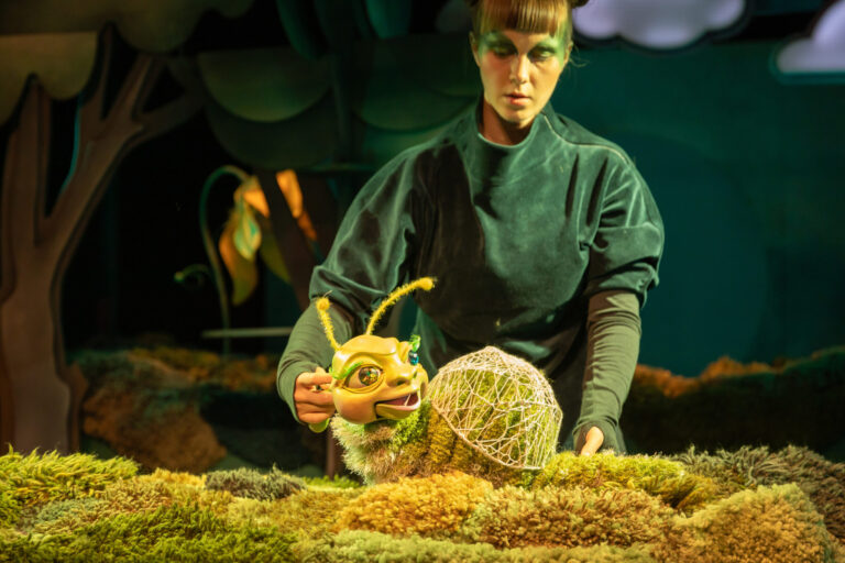 Getter Meresmaa hooaja esimeses uuslavastuses “Lenda-lenda, röövik”, mis räägib väikelastele loo liblika eluringist. Fotod: Siim Vahur