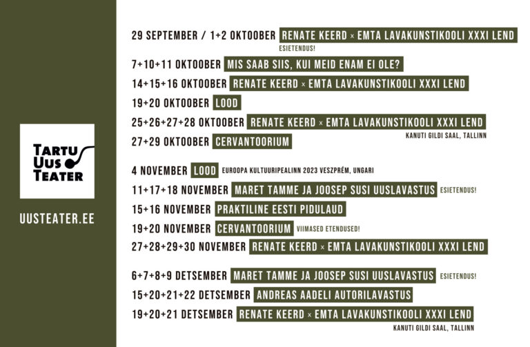 Täpsema mängukava leiab uusteater.ee ning kuna saalid on meil väikesed ja täituvad kiiresti, tasub külastusi aegsasti broneerida.