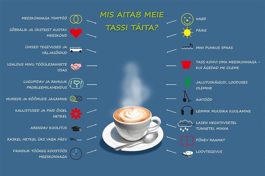 Töörõõmu pakuvad ka igapäevased lihtsad asjad. Kohvipausidel me põhimõtteliselt ei räägi tööst, vaid jagame häid uudiseid. Kiikedel saab päeva jooksul leida kasvõi kümme minutit aega iseendale. Fikas kõlab laekõlaritest vaikne muusika. Seintel on kirjas toetavad sõnumid: „Sa oled armas“, „Tark ei torma“, „Väljakutsed loovad võimalusi“, „Õnnelik on see, kellel on aega elada“ jne.