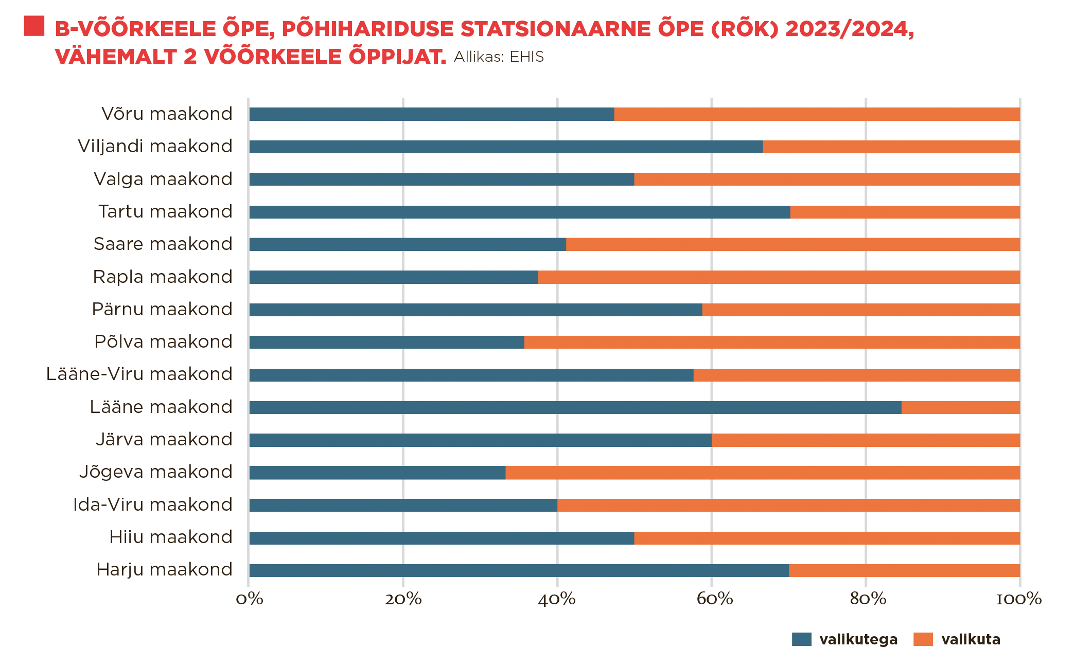 Üle poolte koolidest Lääne, Tartu, Harju, Viljandi, Järva, Pärnu ja Lääne-Viru maakonnas pakub õpilastele B-võõrkeele valikuid. Kõige vähem saavad õpilased valida Jõgeva, Põlva ja
