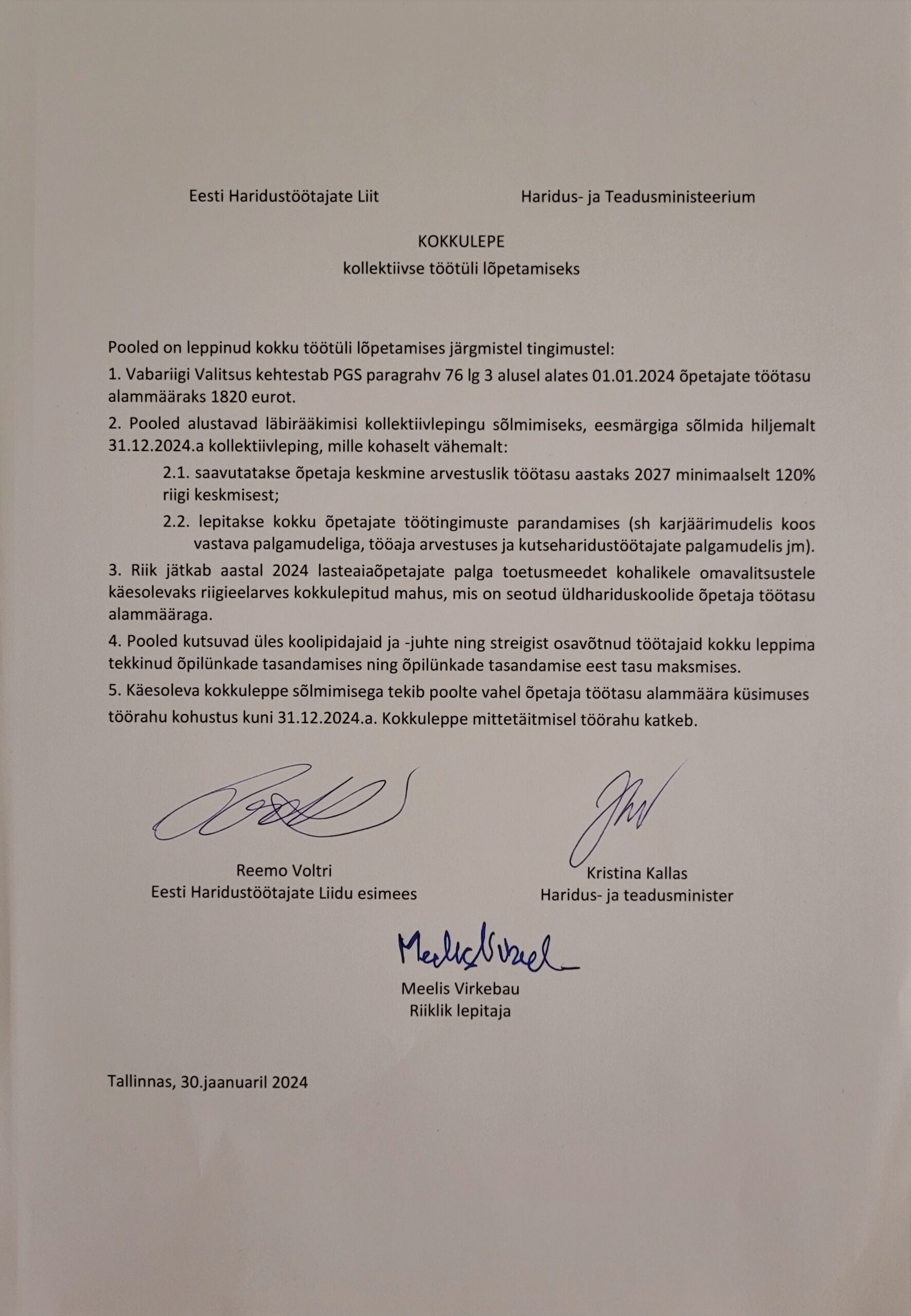 Aga vaatame nüüd ka suurt pilti. Esimest korda Eesti ajaloos on riiklikult algatatud õpetajate palga ja töötingimuste parandamiseks pikaaegse kollektiivlepingu sõlmimise protsess. Ehk riik võtab endale pikaaegsed kohustused, seda ka eelarvestamisel. Detsembris anti EHL-ile selgelt mõista, et selliseid volitusi ega soovi kollektiivlepinguga edasi minna haridusministrile ei anta. Me allkirjastasime lepingu, mis paneb riigile kohustuse, ning lepingu punktide rikkumise korral katkeb töörahu automaatselt. Me tõime lauale alushariduse ja kutsehariduse palgateema, millega minnakse edasi.