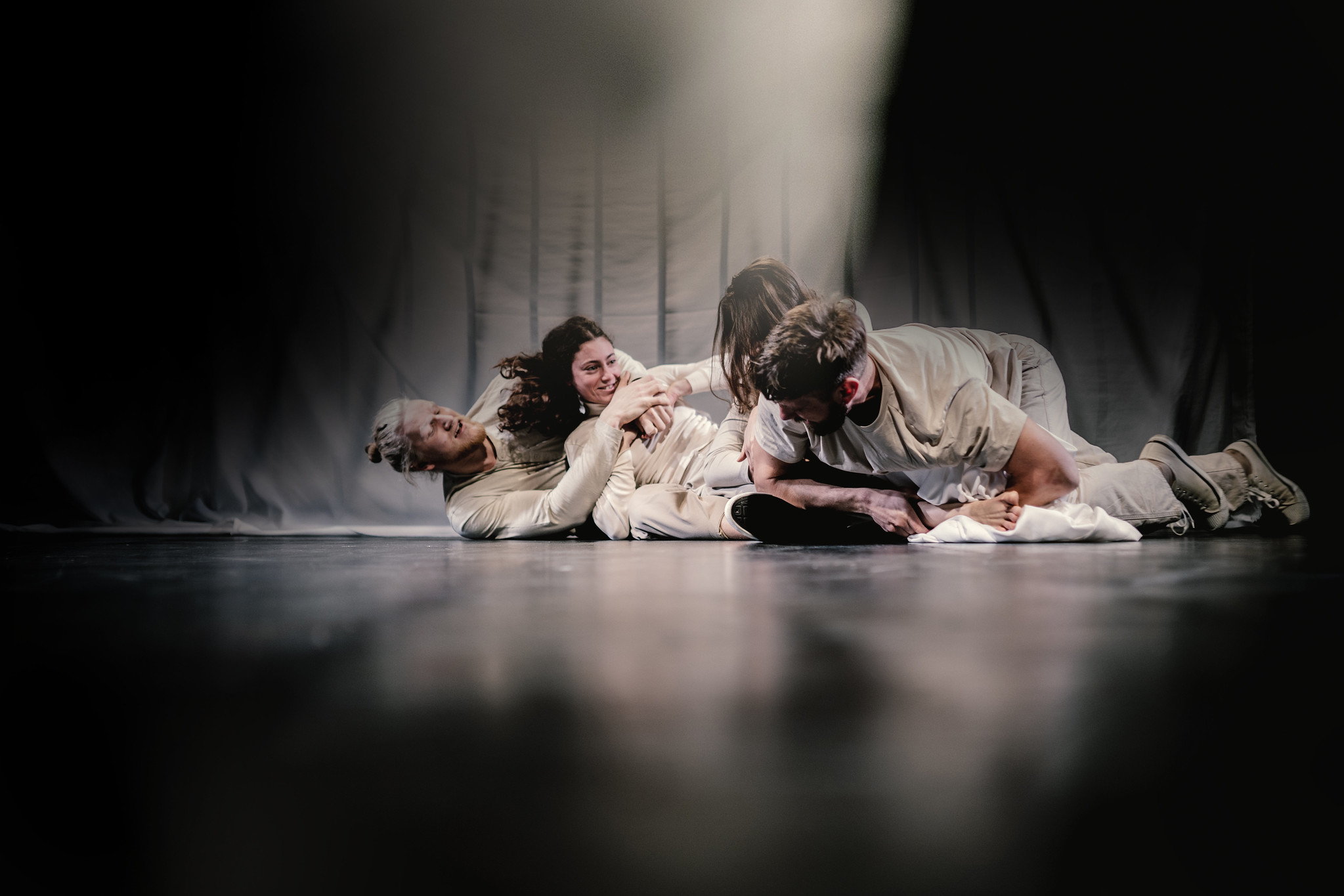 Märtsis, aprillis ja mais mängime Renate Keerdi lavastust „Päva lõpuks, kiigu“. Näitlejaid on laval terve EMTA lavakunstikooli XXXI lennu jagu, 16 tudengit. Renate lavastusi kirjeldab kirjeldamatus, nii et ütleme vaid, et see põimib elu absurdsuse ja efektse füüsilise liikumise. Lavastus on eriti sobilik neile, kes soovivad sissevaadet lavaka tegemistesse. Et lend on kooli lõpetamas, toimuvad etendused vaid väljakuulutatud kuupäevadel Tartus ja Tallinnas.