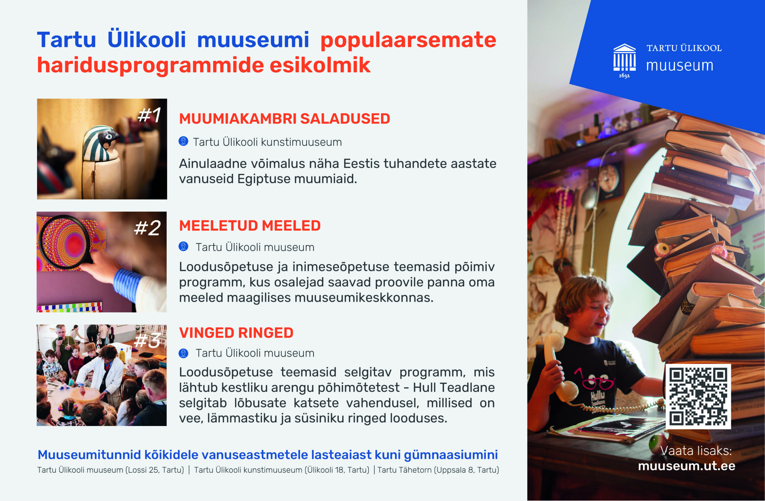 Loodame 2024. aastal oma vanade heade tuttavatega taas kohtuda ning ootame kõiki, kes veel ei ole Tartu Ülikooli muuseumi kui õppimispaika enda jaoks avastanud. Ja kui vahemaad või ajanappus Tartusse tulekul takistuseks on, siis võtame muuseumi kohvris kaasa ja tuleme teile külla!