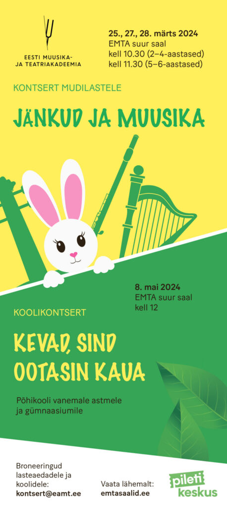 Ootame mudilasi 25., 27. ja 28. märtsil kontserdile „Jänkud ja muusika“, kus saab tutvuda põnevate pillidega ning kaasa laulda ja tantsida. Igal päeval toimub kaks kontserti: kell 10.30 vanusele 2–4 ja kell 11.30 vanusele 5–6. Lasteaiagruppi saatvatele õpetajatele on sissepääs tasuta!