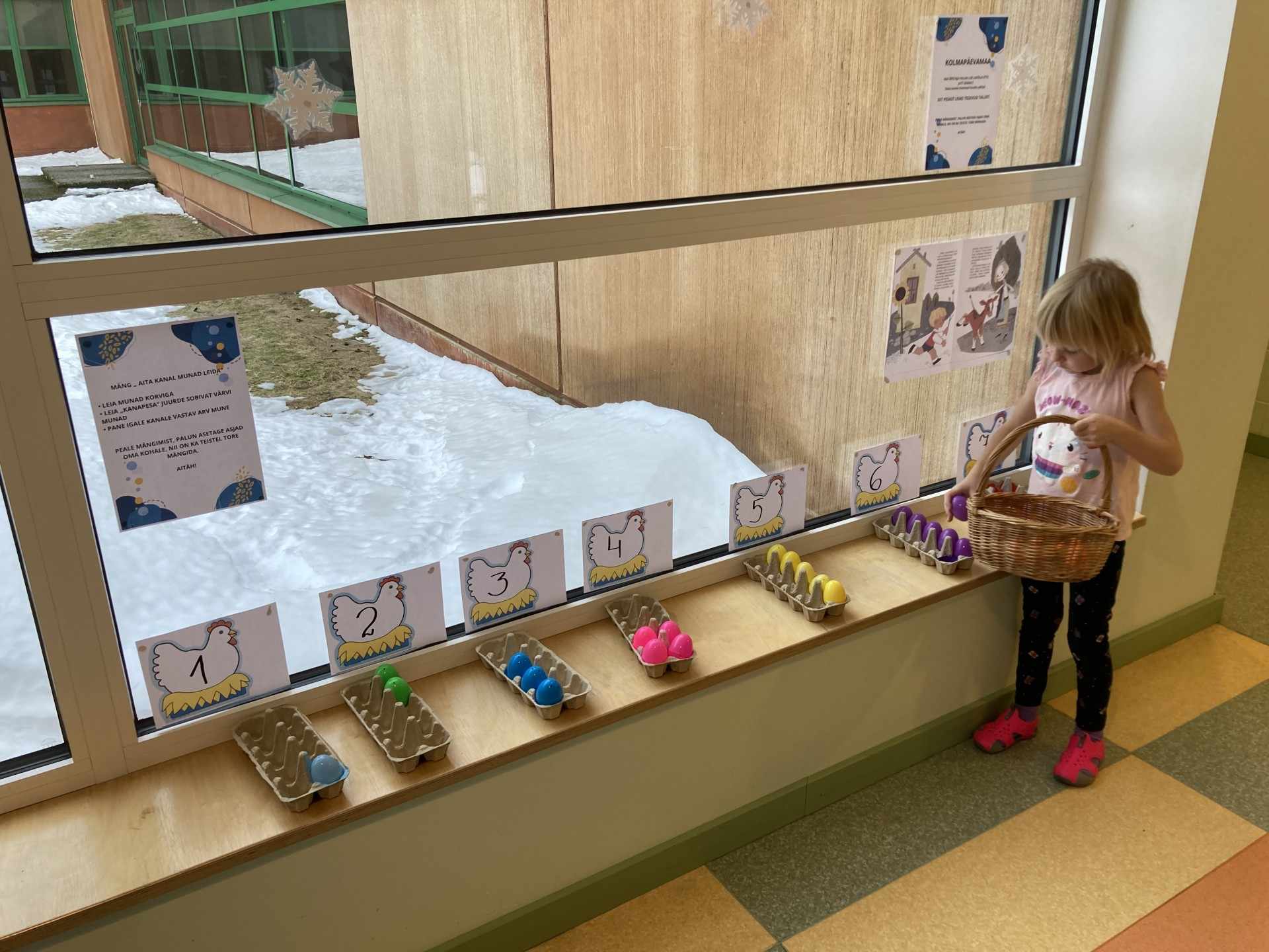 Eesti kirjanduse päeva tähistamiseks kavandasime nädala, et anda rühmadele aega endale sobivas tempos lasteaia koridoridesse loodud temaatilisi tegevuspesasid külastada. Ühised koridorid on meie lasteaias iga päev kasutuses ning rühmaõpetajate ideede põhjal luuakse sinna laste jaoks tegevusvõimalusi. Lastele annab see ruumi eraldumiseks ja väljaspool rühmaruume tegutsemiseks.