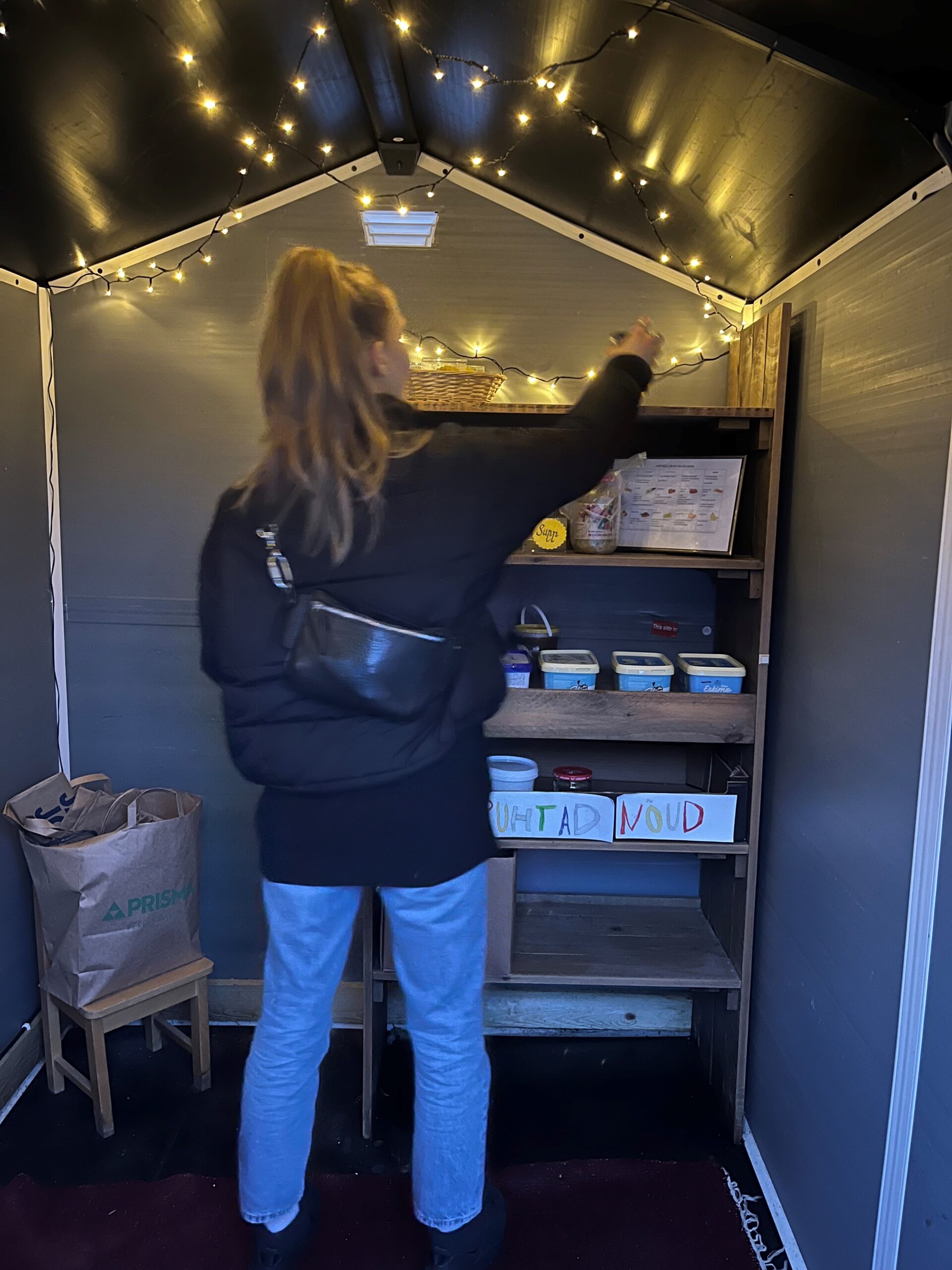 Eelmise suve hakul seatigi lasteaia õuealal värava juures asuvas väikeses aiamajas sisse toidukapp. Et majake seisab lasteaiahoonest natuke eemal, on vanematel mugav lapsele järele tulles enne kojuminekut sealt läbi astuda ja lasteaias valmistatud toitu kaasa võtta. Lisaks on see korraldatud piisavalt anonüümselt, kui keegi peaks ebamugavust või valehäbi tundma. Üks pere tõi kodust kasutatud külmkapi, kuhu pannakse toit soojal ajal, miinuskraadidega nagu praegu leiab toidukarbid seinal olevatelt riiulitelt. Ka taaskasutatavad karbid ja topsikud tõid vanemad kodust, nii et poest midagi osta ei tulnud.