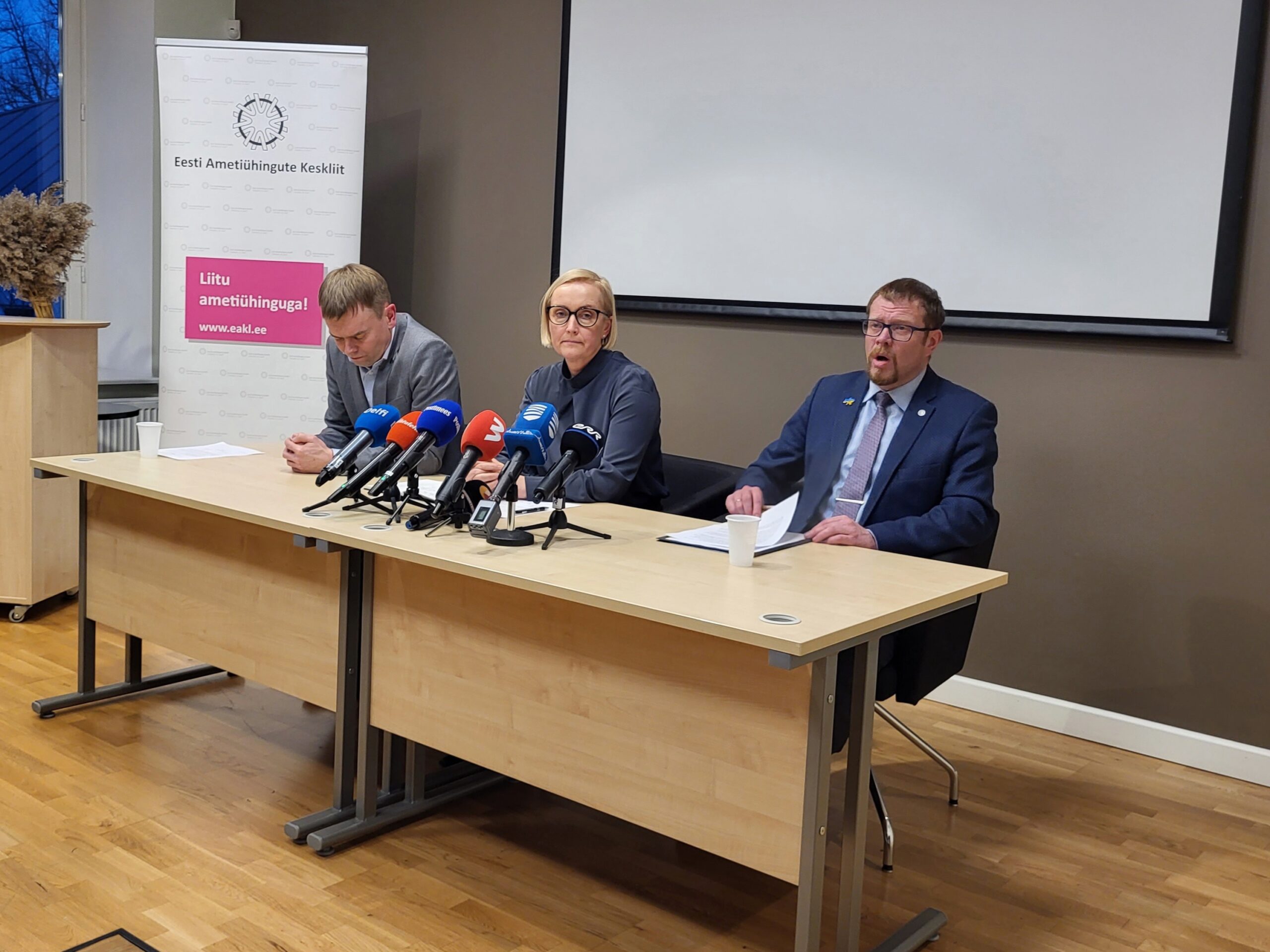 Pressikonverents 30. jaanuaril, kus töötüli lahendamisel jõuti kokkuleppele ning streik otsustati lõpetada. Vasakult EHL-i teabejuht Janno Isat, haridusminister Kristina Kallas, EHL-i juht Reemo Voltri.