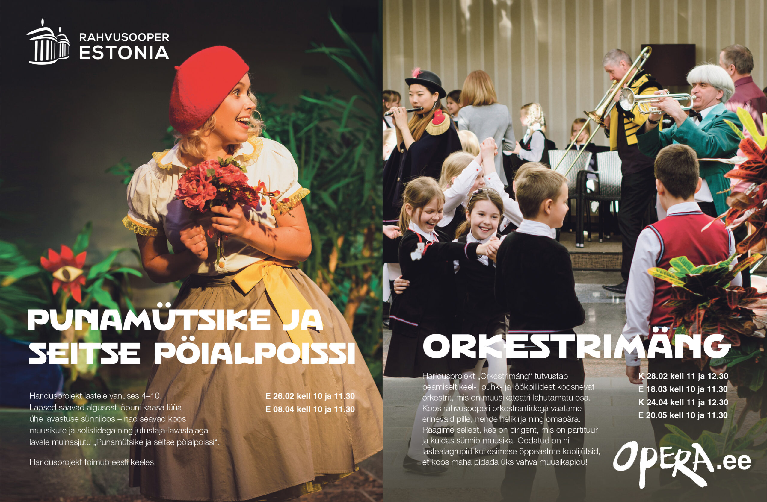 Just nii kõlab tervitus lastele suunatud haridusprojektidel „Punamütsike ja 7 pöialpoissi“ ning „Orkestrimäng“. Mõlemaid programme viiakse läbi Estonia restoranis, kus on palju rohelust ja avarust.