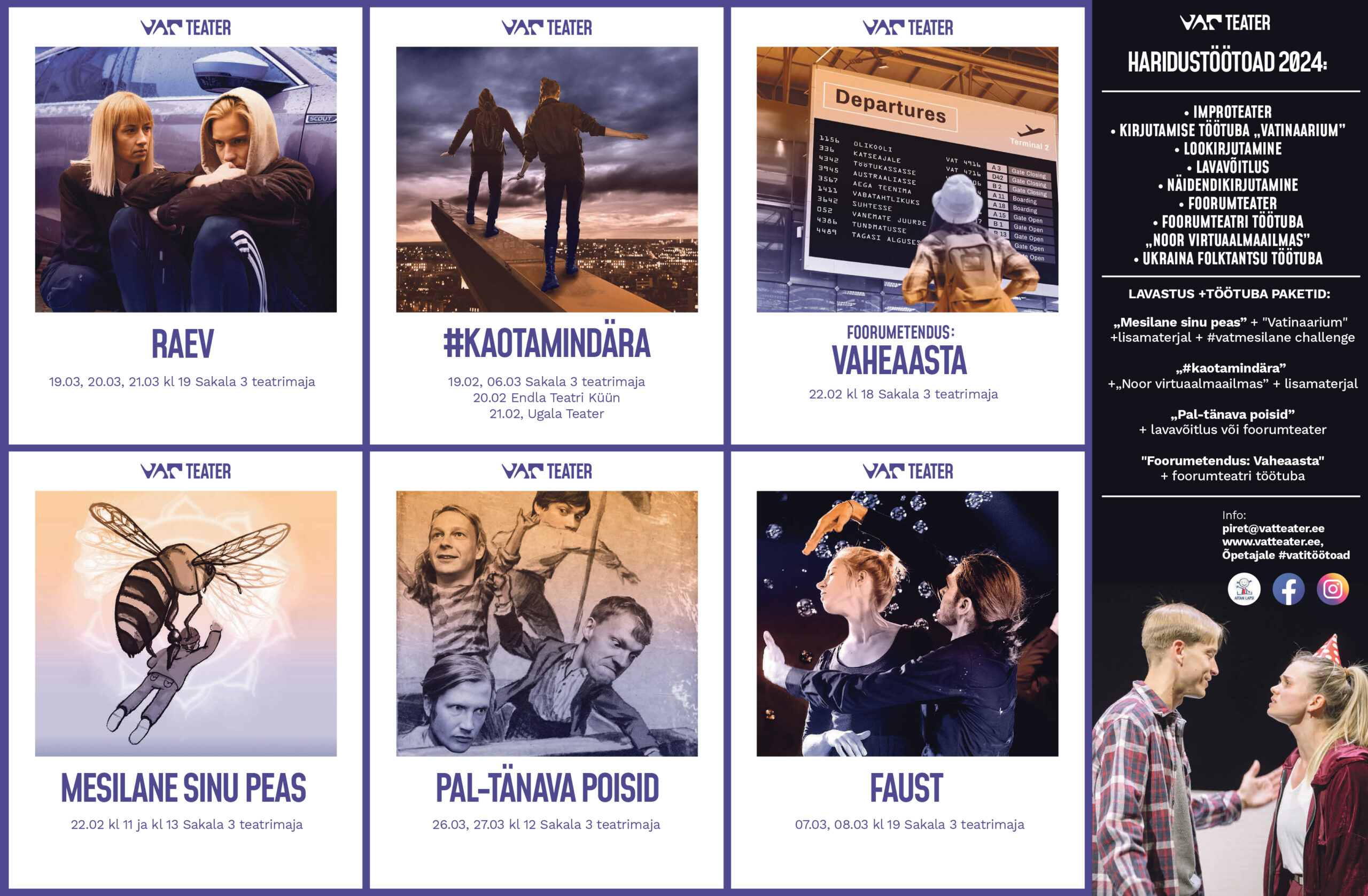 Koostöös Endla teatriga korraldab VAT tänavust koolinoorte teatripäeva, mis toimub 26. märtsil Haapsalus. Sündmus kannab alapealkirja „Teatri mitu nägu“ ja tutvustab Läänemaa kooliõpilasele töötubade ja loengutega tänase teatri eri žanre, vorme ja võimalusi. Samuti saab 26. märtsil näha eesti teatriprofessionaalide ja Läänemaa noorte koostöös valminud lavastust, kus sama lugu mängitakse kolmes teatrivõtmes. Töötubadesse registreerimine algab 4. märtsil. Rohkem infot koolinoorte teatripäeva kohta leiab VAT Teatri kodulehelt.