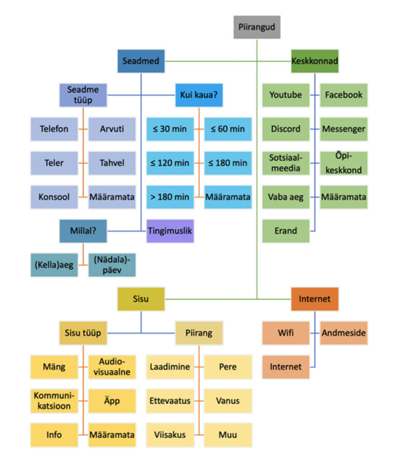 Saadud vabavastuste põhjal lõime piirangute mitmekesisust kirjeldava piirava vahendamise raamistiku (vt joonis 1). Raamistik kirjeldab piirangute kategooriaid, alamkategooriaid ning muutujaid. Kõige rikkalikumat infot andsid vastajad seadmete piirangute kohta, mis võimaldas eristada alamkategooriaid seadme tüübi, selle kasutamise kestuse, kasutamisaja ning tingimuslike piirangute esinemise järgi. Näiteks võib õpilasel olla piiratud nutitelefoni (seadme) kasutamine kahe tunniga ööpäevas (kestus) või mängukonsooli kasutamine lubatud ainult nädalavahetusel (nädalapäeva piirang) või enne kella kaheksat õhtul (kellaaja piirang) või pärast seda, kui kodused tööd on tehtud (tingimuslik piirang). Lisaks konkreetsetele seadmetele mainiti sageli piiranguid, mis puudutasid määratlemata digiseadmeid (nt ekraanid ja nutiseadmed).