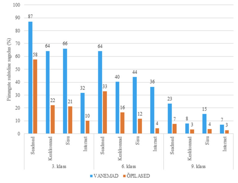 DigiEfekti tulemused näitasid, et lapsevanemad ja õpilased tõlgendasid piirangute olemasolu erinevalt: lapsevanemate vastuste põhjal esineb digipiiranguid 68% uuritud kodudes, õpilaste vastuste põhjal vaid 41% kodudes. Lõhe piirangute suhtelises sageduses lapsevanemate ja õpilaste vastustes kajastub ka klasside võrdluses (vt joonis 2) ning leidis kinnitust kui statistiliselt oluline erinevus.