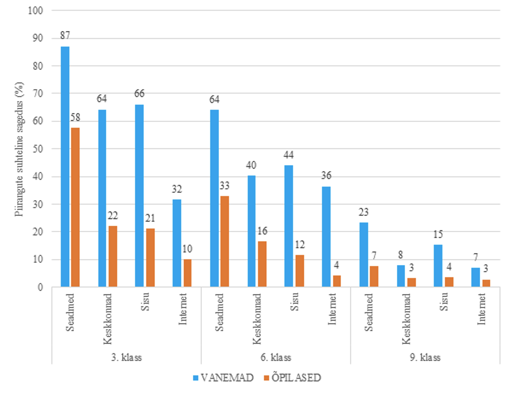 Nii lapsevanemate kui ka õpilaste vastuste põhjal esineb kodudes kõige sagedamini seadmete piiranguid. Keskkondade ning sisu piiranguid esineb mõlemas grupis vähem (õpilastel üle kahe korra vähem kui seadmete piiranguid) ning kõige harvemini esineb nii õpilaste kui ka vanemate vastuste põhjal internetipiiranguid (umbes kaks korda harvemini kui sisu piiranguid). Internetipiirangute tegelik sagedus võib siiski olla kõrgem, sest seadmekasutuspiirangud võivad puudutada (ka) internetiühenduse piiramist seadmes.