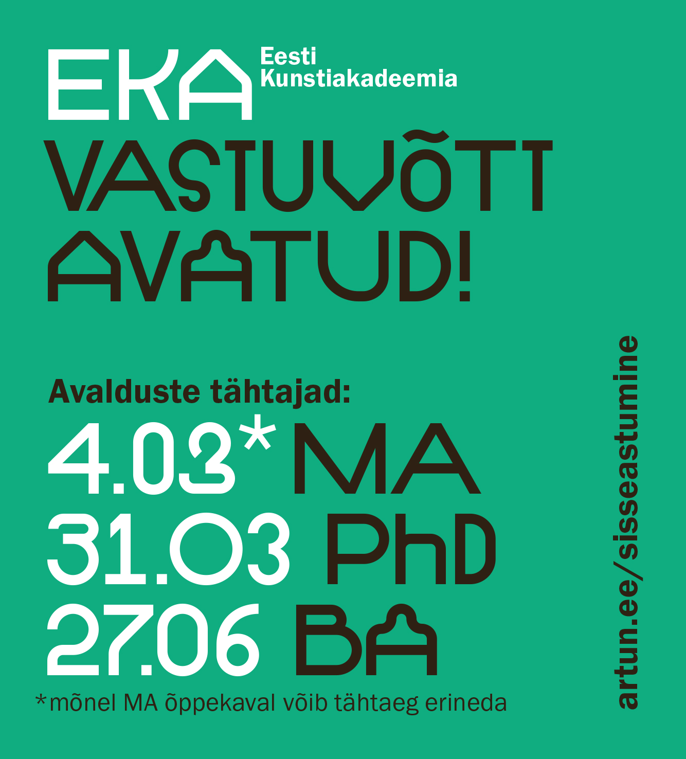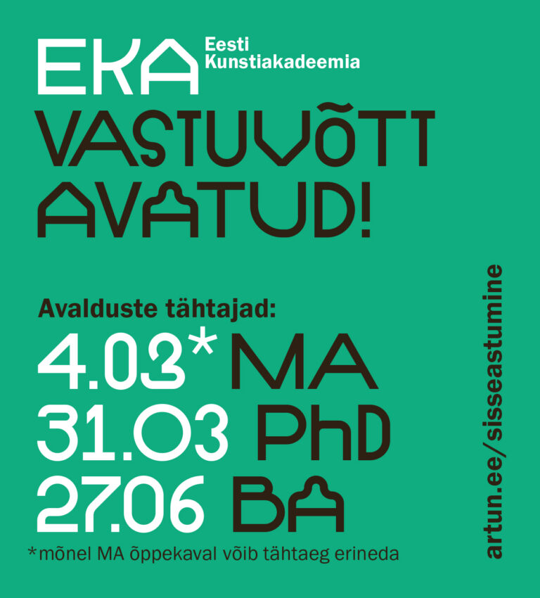 Sisseastumisavalduste vastuvõtt Eesti Kunstiakadeemiasse on avatud ja avaldusi bakalaureuseõppesse oodatakse tänavu kuni 27. juunini. Kunstiõpetaja magistriõppekavale, mida pakutakse ühiselt Tallinna Ülikooliga, saab avaldusi esitada 1. juulini.