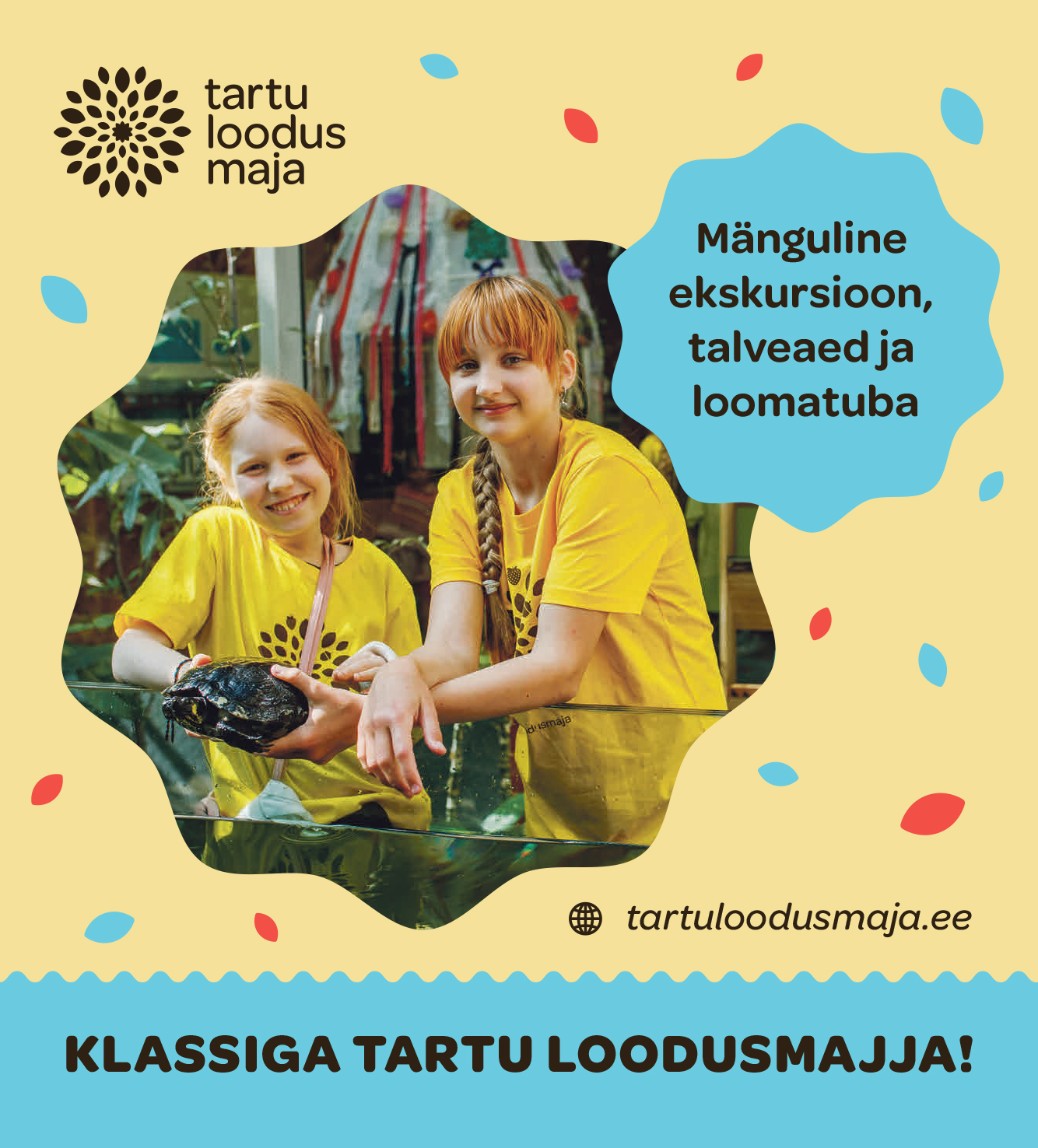 Näitame hea meelega lasteaialastele ja kooliõpilastele oma maja. Räägime kilpkonnakeeles teistest põnevatest loomadest ja eksootilistest taimedest talveaias. Demonstreerime õpilastele enda kaunist kilpi, räägime kõigusoojaste kõikuvast elust ja vajadusel jookseme isegi eest ära. Peale meie on loodusmajas teisigi ütlemata toredaid asju. Mõtle, talveaia džunglis kasvavad papaiad, banaanid, sidrunid, punased kohvipuumarjad ja ronib must pipar.