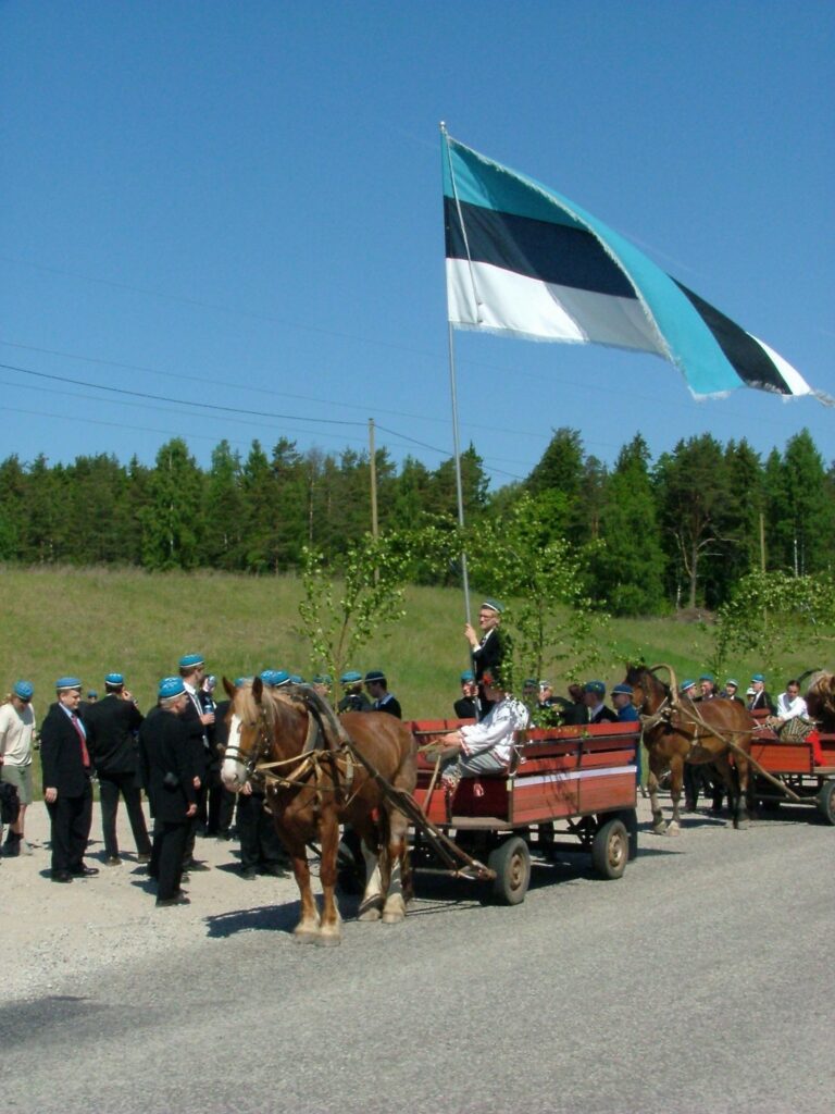 EÜS-i liputoimkond hobuvankriga teel Otepääle lipp 120 tähistamisele 4. juunil 2004. Foto: Martti-Jaan Miljan