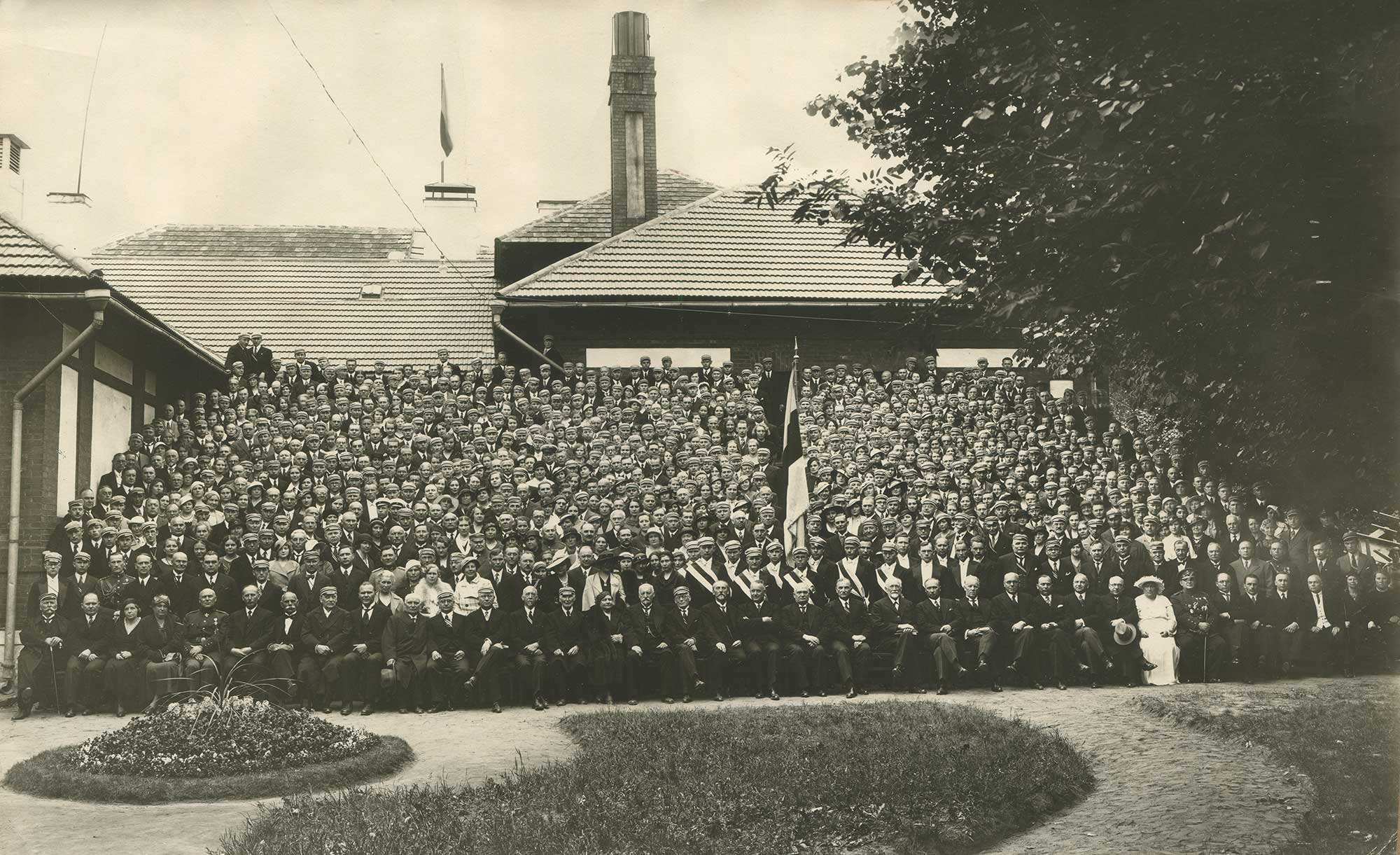 Üle 800 inimesega ühisfoto sinimustvalge lipp 50 pidustustel EÜS-i maja hoovis 3. juunil 1934. Esireas on esimese lipu pühitsemisel osalenud EÜS-i liikmed ja vilistlased Jaan Tõnisson, Kaarel Eenpalu jt. Esireas keskel on ka Konstantin Päts ja Johan Laidoner. Foto autor A. Lomp. Viljandi Muuseum