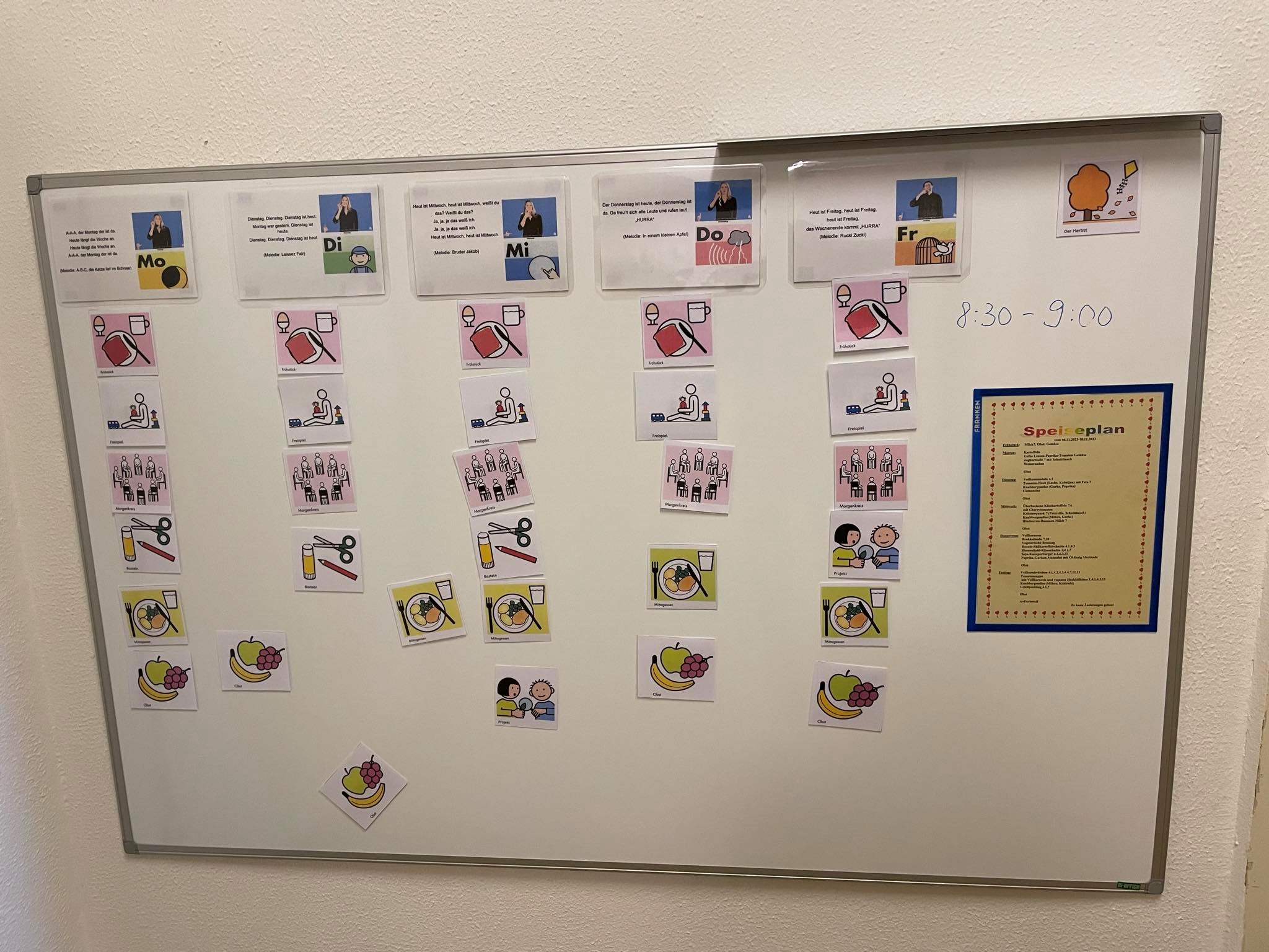 Kõigis lasteaedades, kus käidi, olid tema sõnul kasutusel ühtse süsteemi järgi loodud kognitiivsed sümbolkaardid kõikvõimalike teemade kohta, alates käitumisreeglitest ja päevakavast ning lõpetades riietumise ja menüüga. Omavaheline suhtlemine ja saksa keele omandamine käiski suures osas piltide abil. Hommikuring nägi välja nii, et õpetaja näitas lastele pilte ja selgitas selle kõrvale lihtsas keeles, milliseid tegevusi sel päeval tehakse. Lisaks kaartidele kasutati mõnes lasteaias ka lihtsustatud viipeid.
