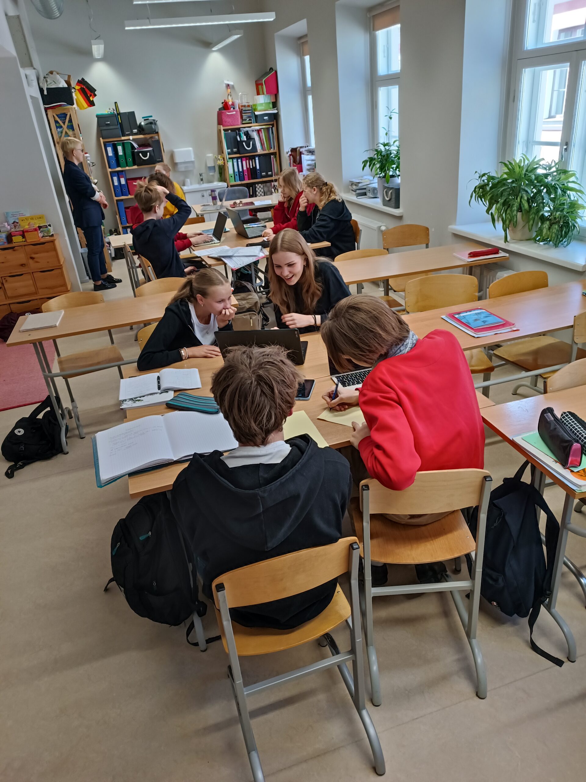 Tunni alguses selgitasime õpilastele tööülesannet, tutvustasime materjale ning leppisime kokku, et õpilased saavad toimetada loomingulise projektiga kogu kirjandus- ja keemiatunni ehk siis kokku 170 minutit. Grupitööd võis teha klassiruumis või leida koos toimetamiseks vaba sopikese koolimajas. Seejärel loosisime rühmad ja seiklus võiski alata. Meie algne hirm oli asjatu – õpilased haakusid ideega kiiresti ning asusid oma puslet kokku panema.