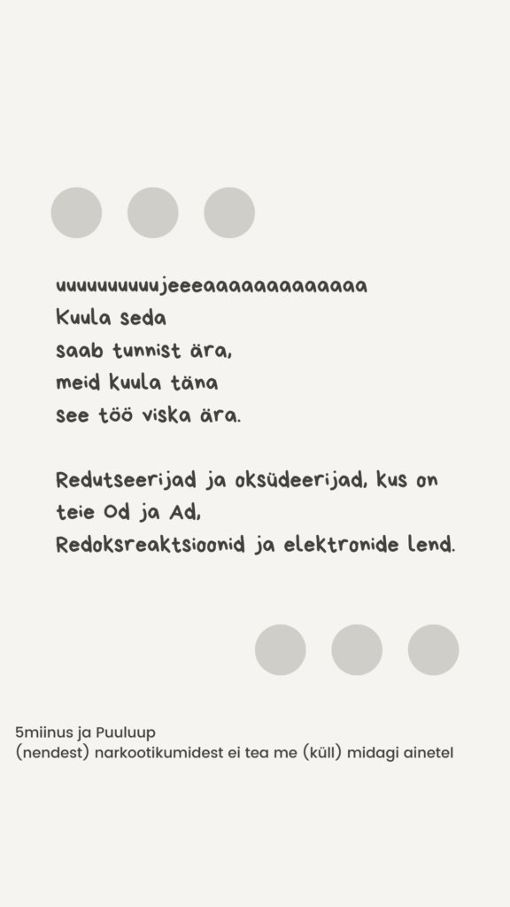 Meie eesmärk oli arendada õpilaste loomingulist ja muusikalist mõtlemist ning meeskonnatöö oskust, aga ka kinnistada kõnekujundite ja redoksreaktsioonide mõisteid.