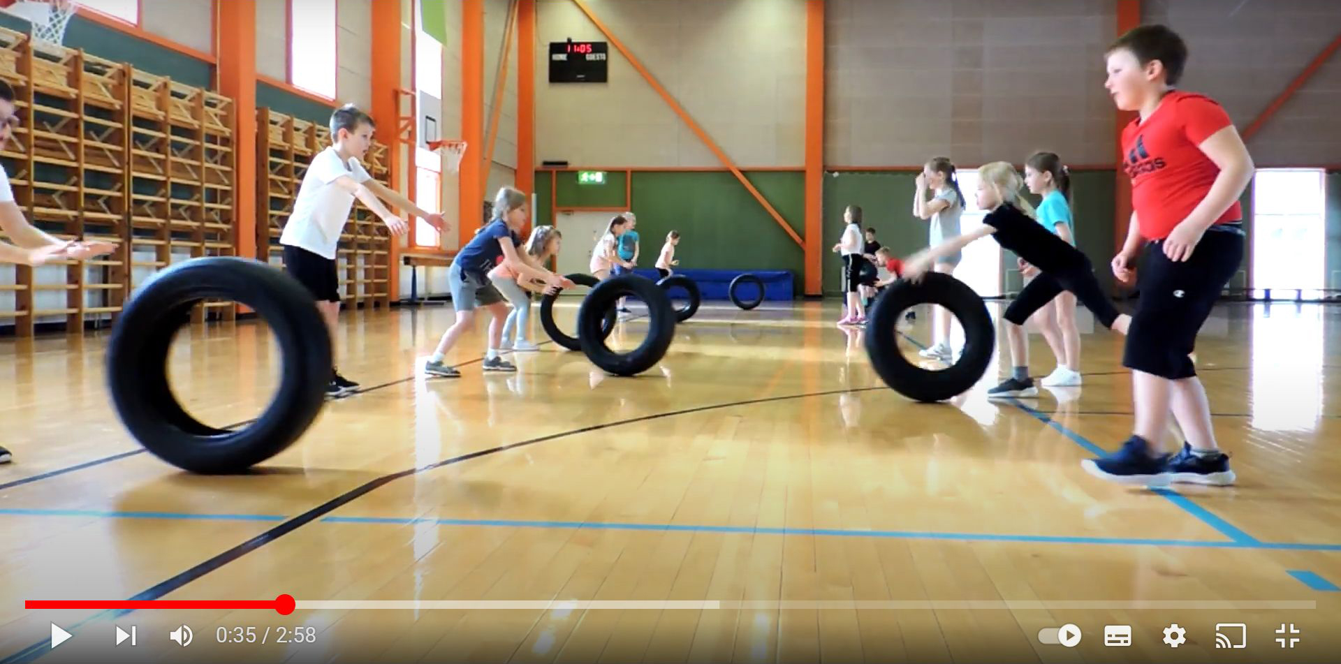 Õpetaja Rückenberg on ka mitmeid uusi võimlemisvahendeid välja mõelnud. Ta on pesnud puhtaks vanad autorehvid, et õpilased saaksid neid tundides veeretada, nende peal tantsusamme harjutada jne. Üks harjutus on selline, et õpilane veeretab rehvi paarilise suunas ja see hüppab rehvist nagu kitsest üle ning veeretab siis rehvi tagasi jne.