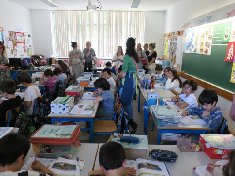 Külastasime tundi, kus kaks kuuenda klassi tüdrukut õpetas teise klassi õpilasi. Teemaks oli paari päeva pärast saabuv vabaduspäev. Suuremad lapsed seletasid väiksematele slaide näidates ära sündmuste alguse (25. aprill 1974) ja kulu. Saime muuhulgas teada, et Portugali naised said valimisõiguse alles 1974. aastal. Pärast ettekannet hakati paberist nelgiõisi meisterdama.