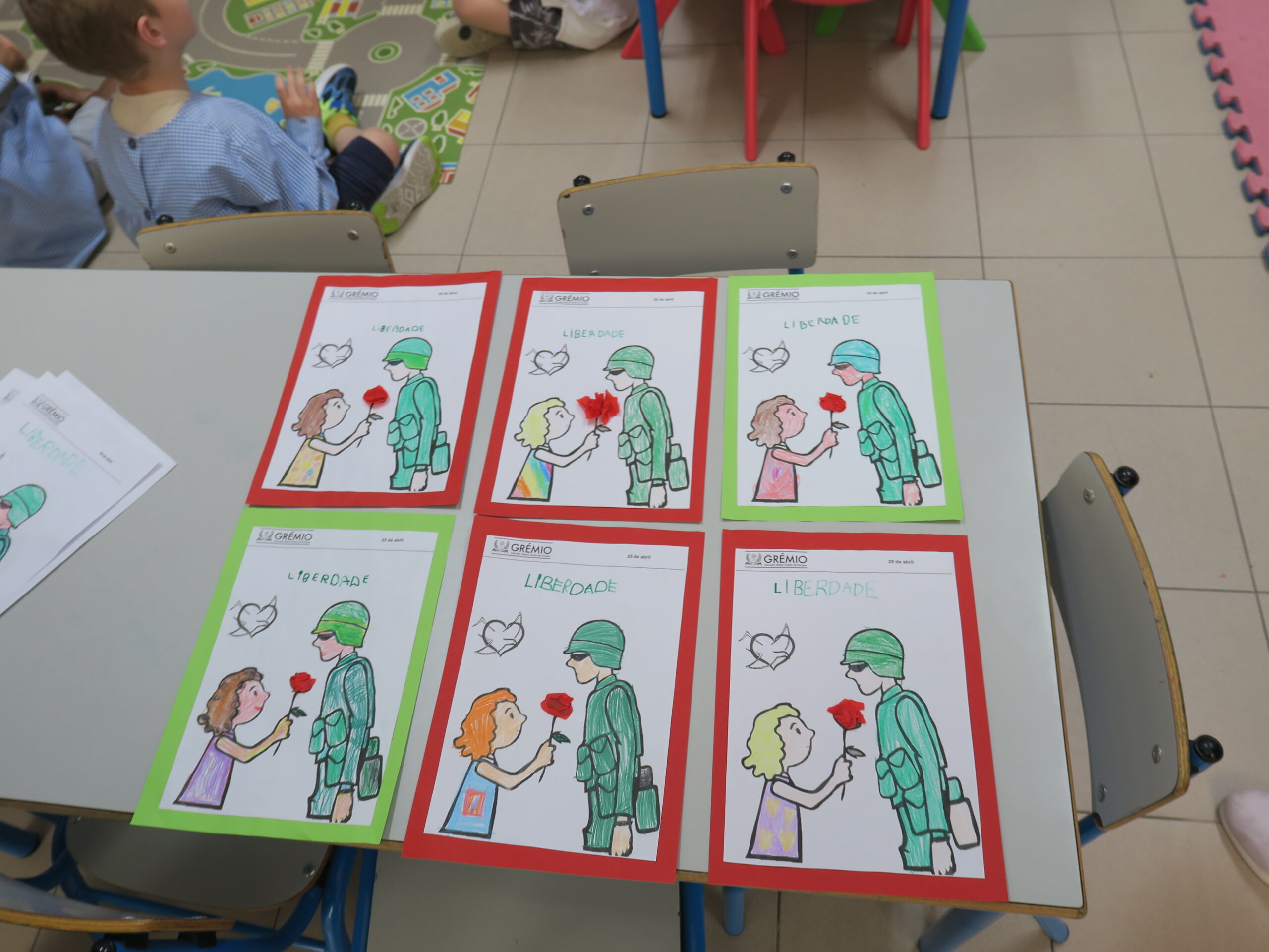 Külastasime tundi, kus kaks kuuenda klassi tüdrukut õpetas teise klassi õpilasi. Teemaks oli paari päeva pärast saabuv vabaduspäev. Suuremad lapsed seletasid väiksematele slaide näidates ära sündmuste alguse (25. aprill 1974) ja kulu. Saime muuhulgas teada, et Portugali naised said valimisõiguse alles 1974. aastal. Pärast ettekannet hakati paberist nelgiõisi meisterdama.