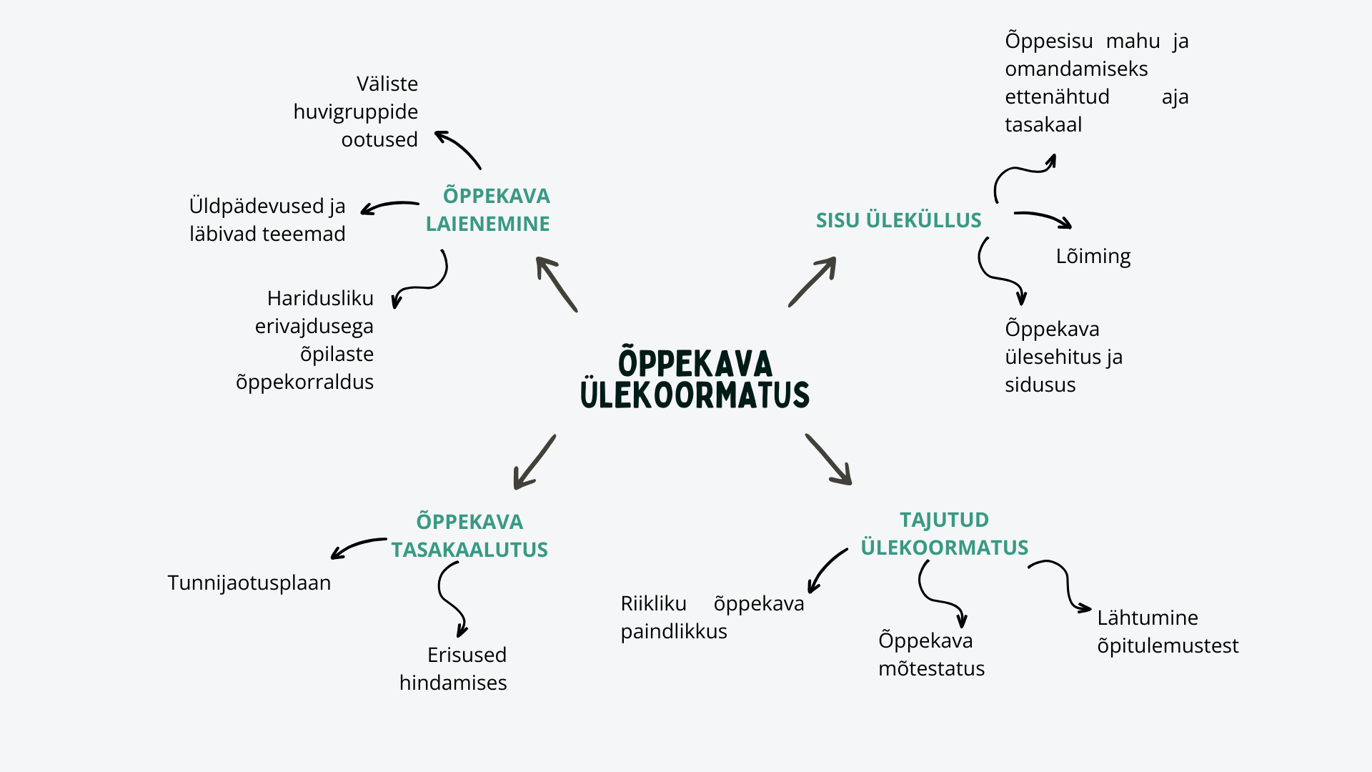 Õppekava ülekoormatuse probleemi mõistmiseks toetusime OECD raportile, kus õppekavade ülekoormatust on mõtestatud lähtuvalt neljast dimensioonist: õppekava laienemine, sisu üleküllus, õppekava tasakaalutus ja tajutud ülekoormatus (vt joonist).