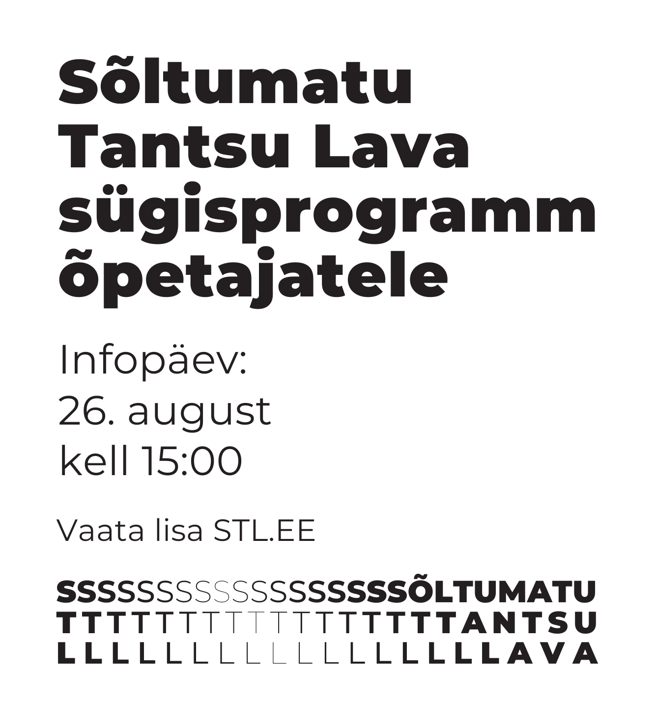 26. augustil toimub STL-is infopäev, kus tutvustame õpetajatele mängukava ja võimalusi, kuidas saada osa meie etendustest ja lisaprogrammidest. Lisaks saab ise läbi teha põneva ja interaktiivse töötoa „Tants, kui kaasaja väljendus“.