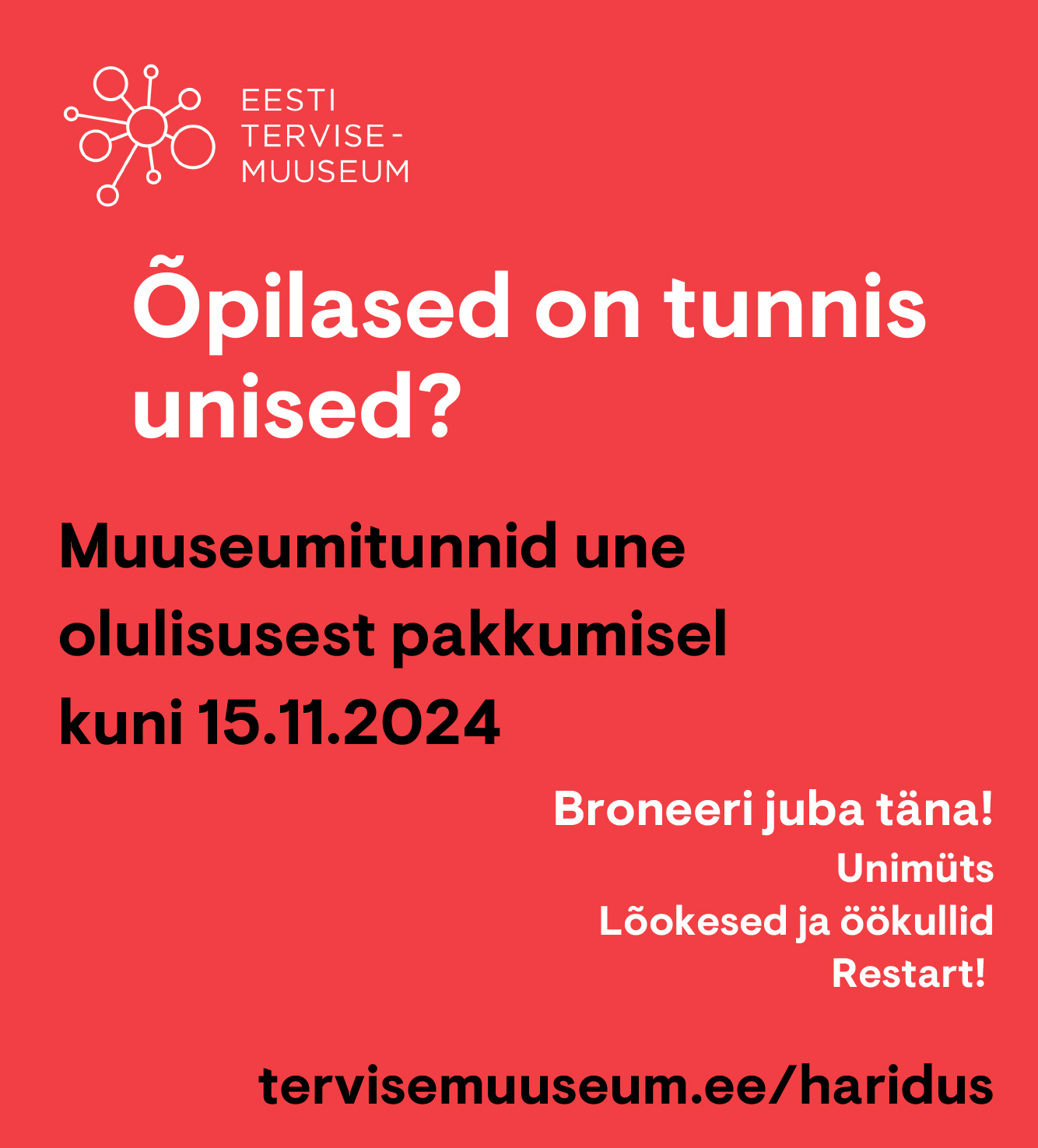 Tervisemuuseumi näitus unest ja magamisest „Uneversum“ on avatud veel viimaseid kuid. Kutsume teid kasutama võimalust kuni 15. novembrini broneerida klassile tund une olulisusest. Muuseumitunnid „Unimüts“, „Lõokesed ja öökullid“ ja „Restart!“ keskenduvad eakohases võtmes laste ja noorte unetervisele ning pakuvad võimalusi, kuidas oma unega sõber olla ja selle kvaliteeti parandada. Aasta jooksul sisse töötatud unetundides avastavad õpilased magamise nüansse mängu, ühiste arutelude ja loovate rühmatööde kaudu. Näiteks 3. kooliastme tunnis „Restart!“ otsime probleemülesannete ja stsenaariumite toel vastust küsimustele, miks noored piisavalt ei maga, millised on peamised une kahjustajad ja mida need võivad kaasa tuua, ning arutleme ühiselt võimalike lahenduste üle.