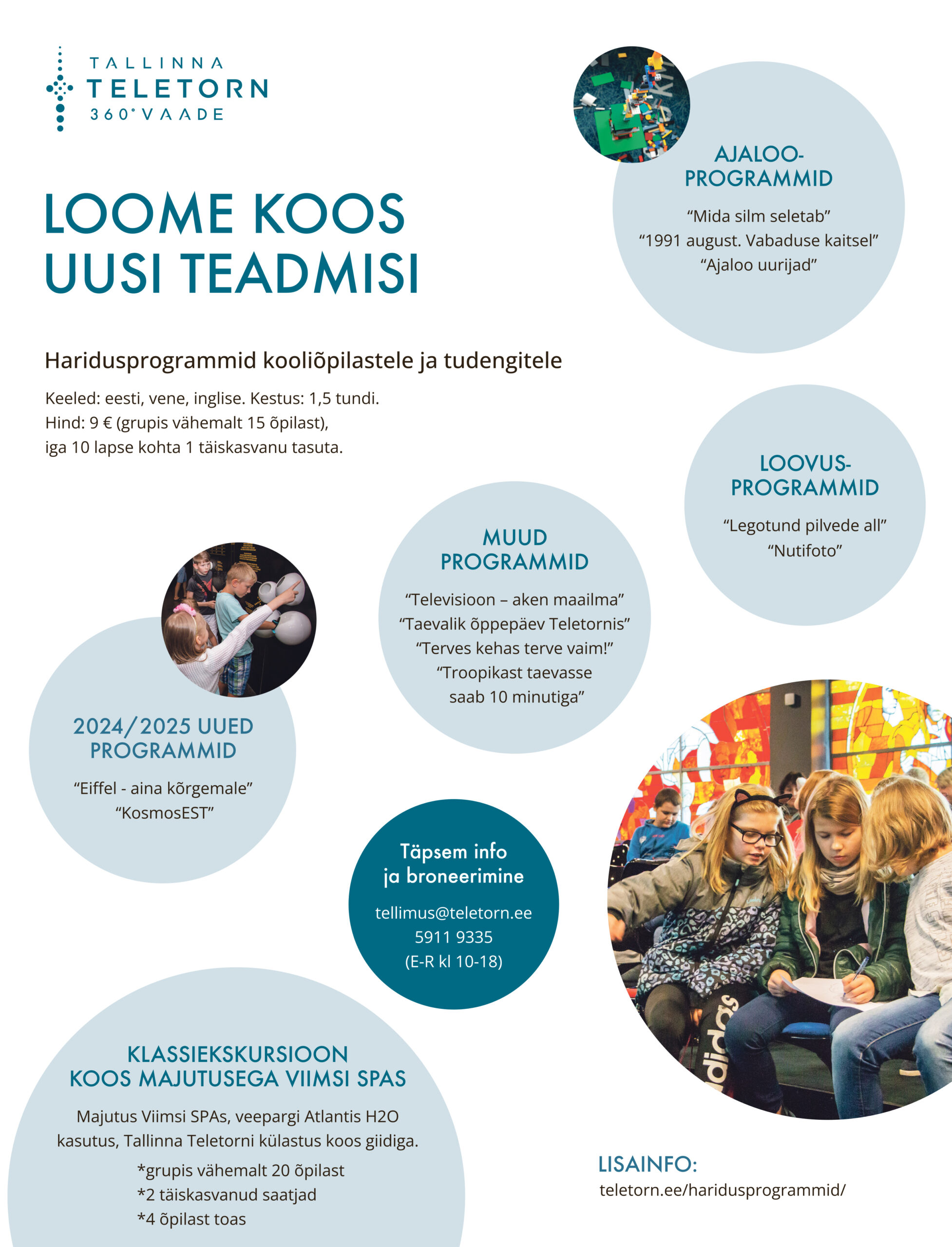Tallinna Teletorn on koolidele avatud kui elav klassiruum, kus õppimine muutub seikluseks ja teadmine tuleb elamuse kaudu. Kui eespool kirjeldatu teid inspireeris ja soovite teletorni pakutavate võimaluste kohta rohkem infot, külastage Tallinna Teletorni veebilehte teletorn.ee või võtke ühendust Raido Roostaluga e-aadressil raido.roostalu@teletorn.ee.